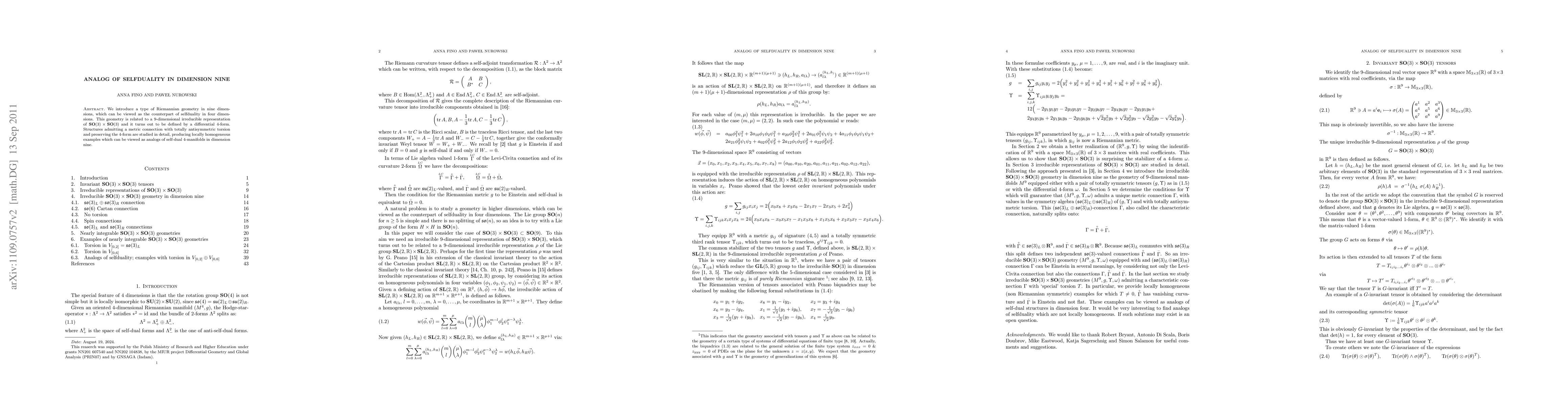 This paper introduces a nine-dimensional Riemannian geometry analogous to selfduality in four dimensions, defined by a differential 4-form and related to a specific irreducible representation of ${\bf SO}(3) \times {\bf SO}(3)$. It studies structures with a metric connection and totally antisymmetric torsion, yielding locally homogeneous examples akin to self-dual 4-manifolds.