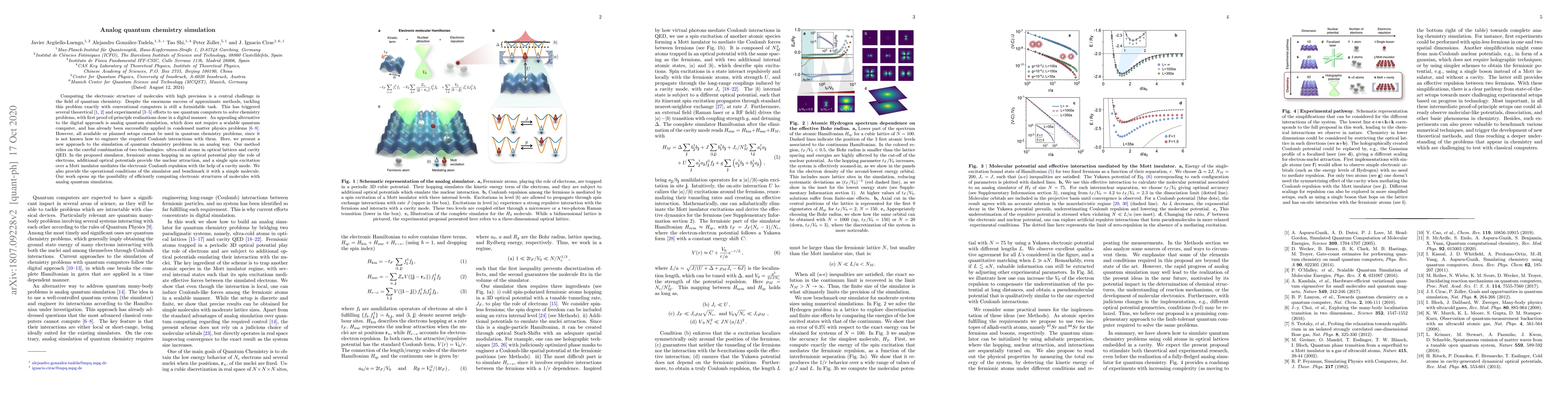 This paper proposes a novel analog quantum simulation method using ultra-cold atoms in optical lattices and cavity QED to accurately compute the electronic structure of molecules, overcoming the limitations of digital quantum computing and previous analog setups by engineering Coulomb interactions. The method benchmarks its feasibility with a simple molecule.