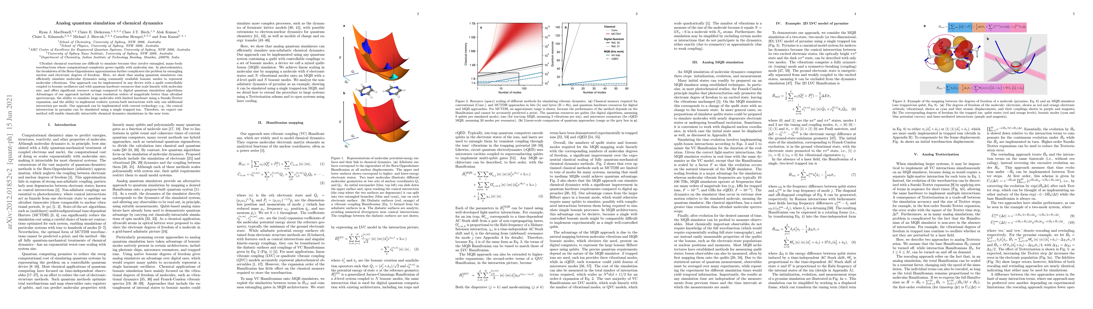 Ultrafast chemical reactions are difficult to simulate because they involve entangled, many-body wavefunctions whose computational complexity grows rapidly with molecular size. In photochemistry, the breakdown of the Born-Oppenheimer approximation further complicates the problem by entangling nuclear and electronic degrees of freedom. Here, we show that analog quantum simulators can efficiently simulate molecular dynamics using commonly available bosonic modes to represent molecular vibrations. Our approach can be implemented in any device with a qudit controllably coupled to bosonic oscillators and with quantum hardware resources that scale linearly with molecular size, and offers significant resource savings compared to digital quantum simulation algorithms. Advantages of our approach include a time resolution orders of magnitude better than ultrafast spectroscopy, the ability to simulate large molecules with limited hardware using a Suzuki-Trotter expansion, and the ability to implement realistic system-bath interactions with only one additional interaction per mode. Our approach can be implemented with current technology; e.g., the conical intersection in pyrazine can be simulated using a single trapped ion. Therefore, we expect our method will enable classically intractable chemical dynamics simulations in the near term.