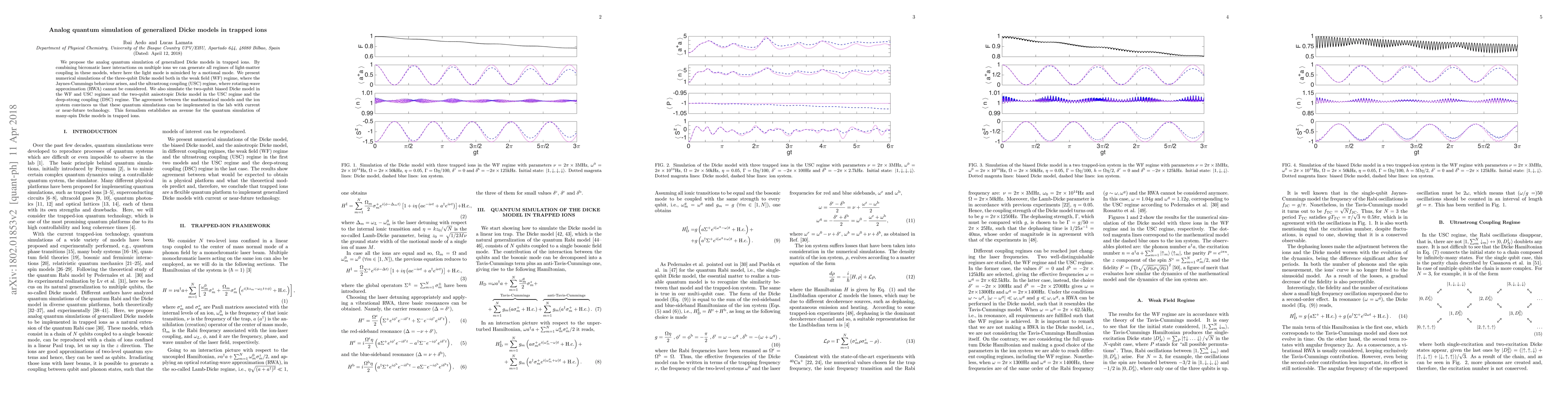 This paper proposes an analog quantum simulation of generalized Dicke models using trapped ions, achieving regimes from weak to ultrastrong light-matter coupling. Numerical simulations confirm the feasibility of these simulations with current technology, paving the way for many-spin Dicke model experiments.