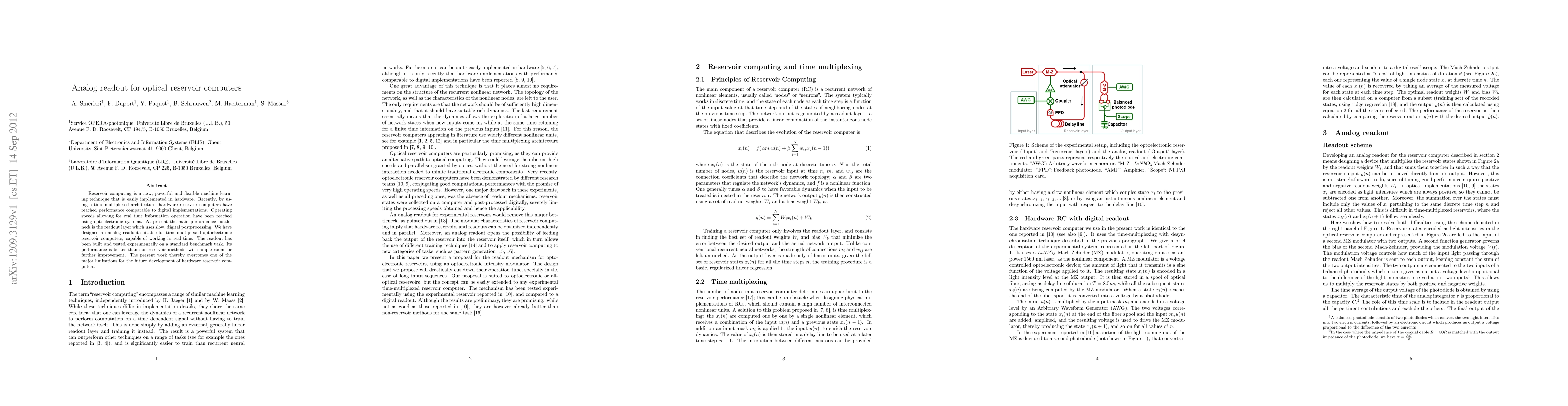 This paper presents an analog readout method designed for real-time operation in time-multiplexed optoelectronic reservoir computers, addressing the performance bottleneck of digital postprocessing. Experimental results show improved performance over non-reservoir methods and potential for further enhancements.