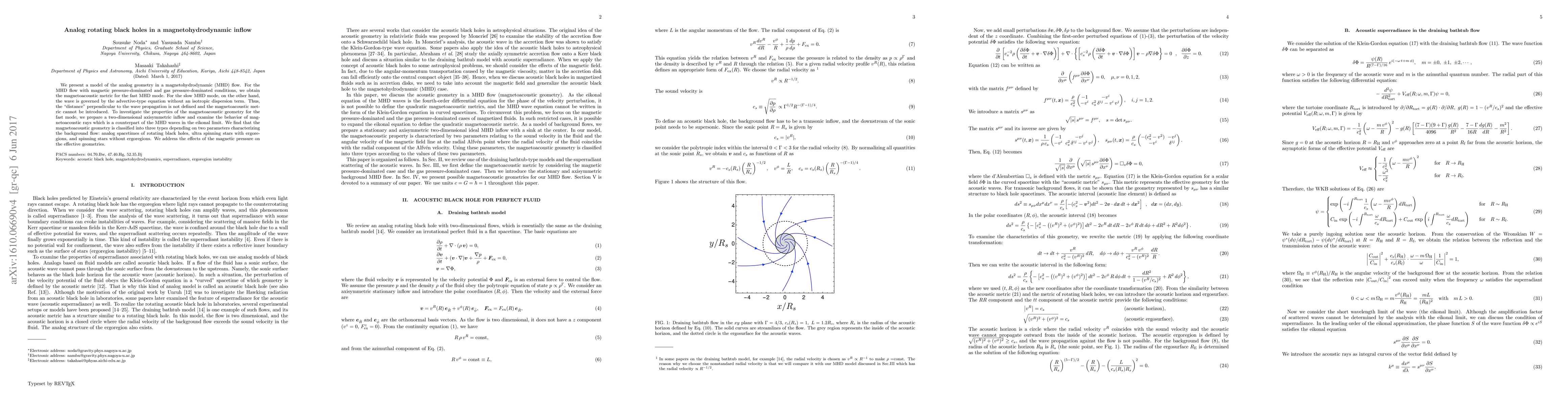 We present a model of the analog geometry in a magnetohydrodynamic (MHD) flow. For the MHD flow with magnetic pressure-dominated and gas pressure-dominated conditions, we obtain the magnetoacoustic metric for the fast MHD mode. For the slow MHD mode, on the other hand, the wave is governed by the advective-type equation without an isotropic dispersion term. Thus, the "distance" perpendicular to the wave propagation is not defined and the magnetoacoustic metric cannot be introduced. To investigate the properties of the magnetoacoustic geometry for the fast mode, we prepare a two-dimensional axisymmetric inflow and examine the behavior of magnetoacoustic rays which is a counterpart of the MHD waves in the eikonal limit. We find that the magnetoacoustic geometry is classified into three types depending on two parameters characterizing the background flow:~analog spacetimes of rotating black holes, ultra spinning stars with ergoregions, and spinning stars without ergoregions. We address the effects of the magnetic pressure on the effective geometries.