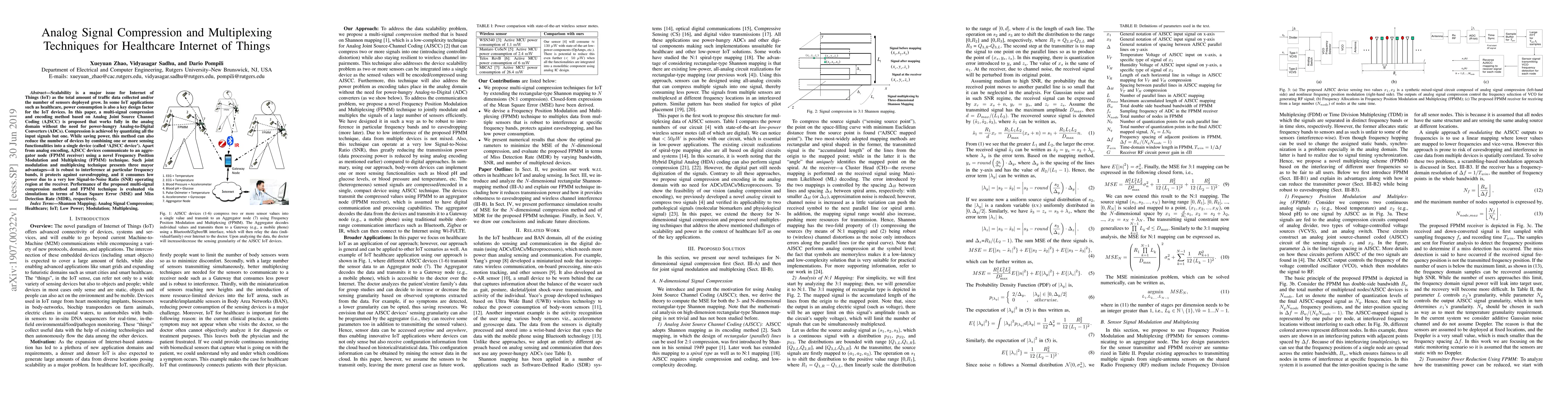 This paper proposes an analog signal compression and multiplexing technique for scalable, low-power IoT healthcare applications. It introduces AJSCC for analog domain compression without ADCs and FPMM for robust, low-power communication, evaluated via MSE and MDR simulations.