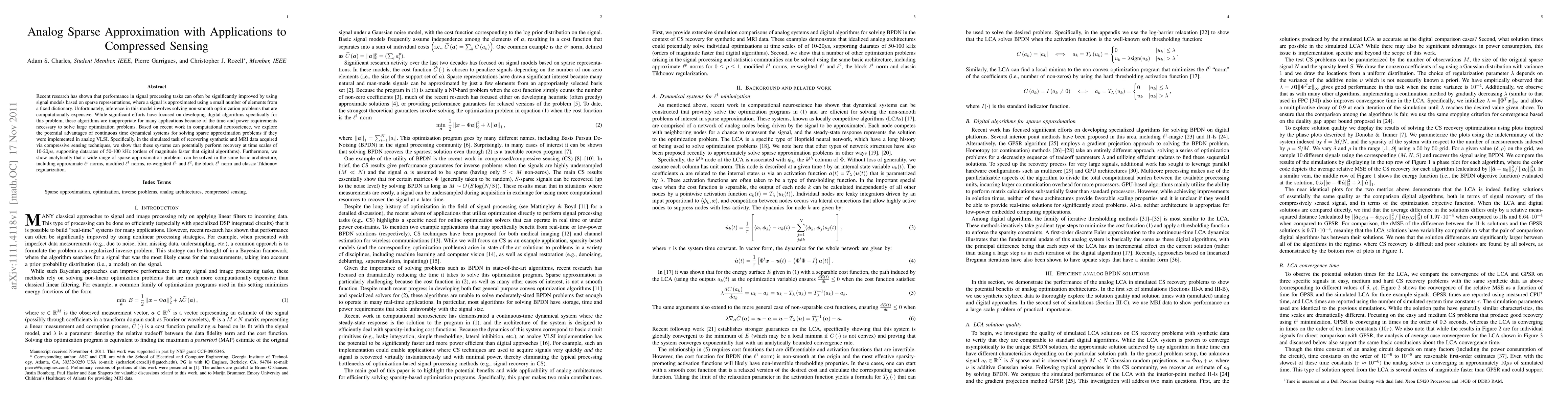 Recent research has shown that performance in signal processing tasks can often be significantly improved by using signal models based on sparse representations, where a signal is approximated using a small number of elements from a fixed dictionary. Unfortunately, inference in this model involves solving non-smooth optimization problems that are computationally expensive. While significant efforts have focused on developing digital algorithms specifically for this problem, these algorithms are inappropriate for many applications because of the time and power requirements necessary to solve large optimization problems. Based on recent work in computational neuroscience, we explore the potential advantages of continuous time dynamical systems for solving sparse approximation problems if they were implemented in analog VLSI. Specifically, in the simulated task of recovering synthetic and MRI data acquired via compressive sensing techniques, we show that these systems can potentially perform recovery at time scales of 10-20{\mu}s, supporting datarates of 50-100 kHz (orders of magnitude faster that digital algorithms). Furthermore, we show analytically that a wide range of sparse approximation problems can be solved in the same basic architecture, including approximate $\ell^p$ norms, modified $\ell^1$ norms, re-weighted $\ell^1$ and $\ell^2$, the block $\ell^1$ norm and classic Tikhonov regularization.