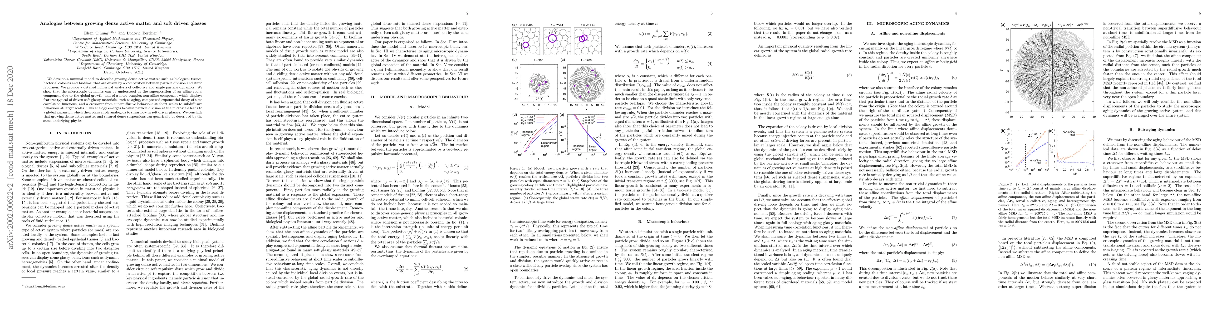 Growing dense active matter, like biological tissues, shows similar physics to soft driven glasses, with aging and unusual diffusion behavior at different scales. This similarity is due to a global expansion from particle division.