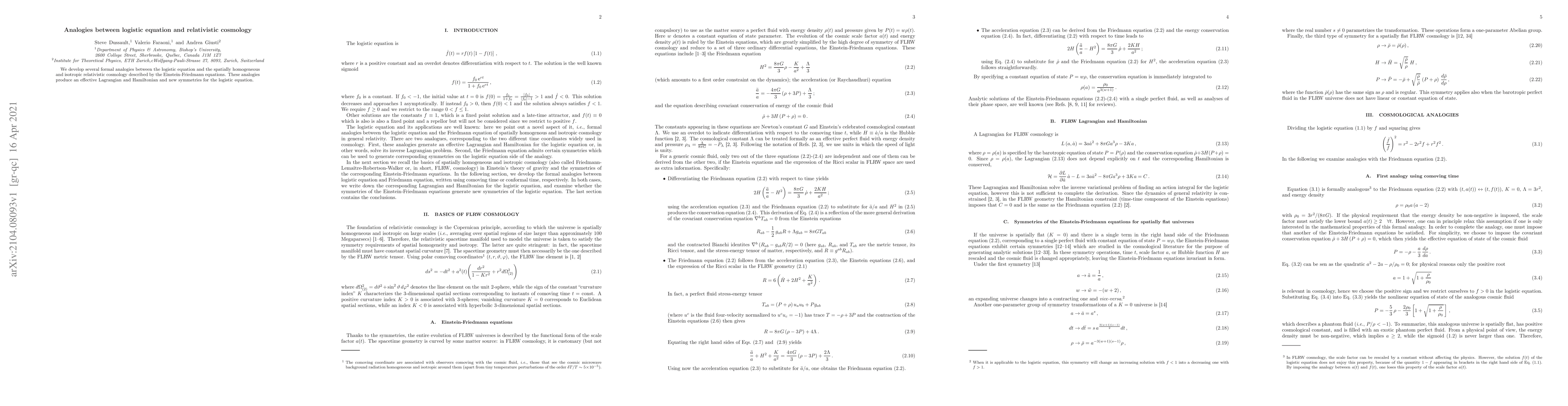 We develop several formal analogies between the logistic equation and the spatially homogeneous and isotropic relativistic cosmology described by the Einstein-Friedmann equations. These analogies produce an effective Lagrangian and Hamiltonian and new symmetries for the logistic equation.