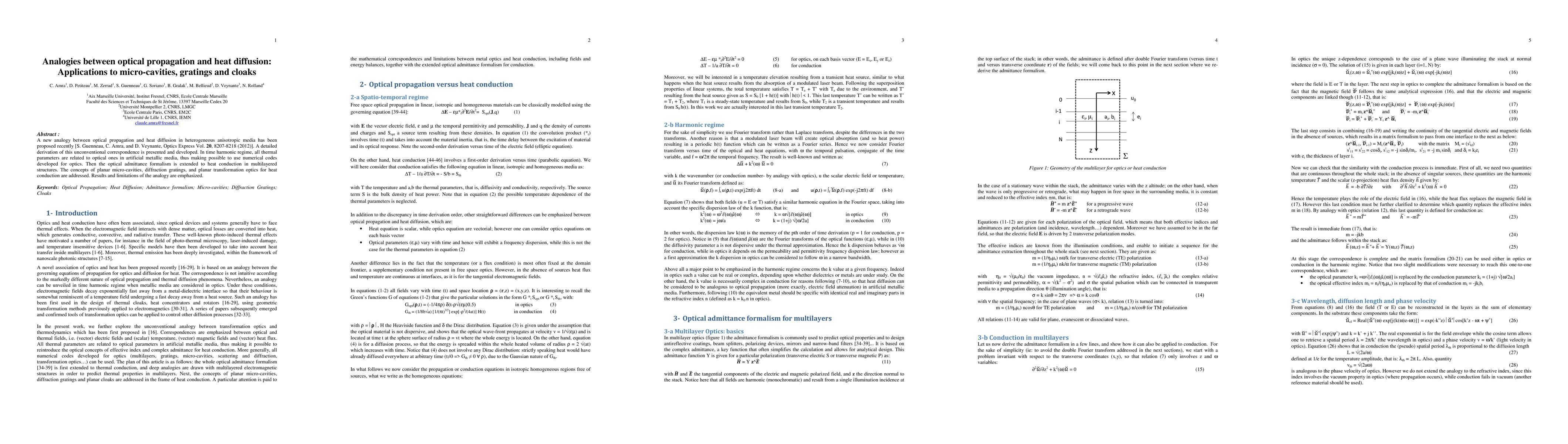 A new analogy between optical propagation and heat diffusion in heterogeneous anisotropic media has been proposed recently [S. Guenneau, C. Amra, and D. Veynante, Optics Express Vol. 20, 8207-8218 (2012)]. A detailed derivation of this unconventional correspondence is presented and developed. In time harmonic regime, all thermal parameters are related to optical ones in artificial metallic media, thus making possible to use numerical codes developed for optics. Then the optical admittance formalism is extended to heat conduction in multilayered structures. The concepts of planar micro-cavities, diffraction gratings, and planar transformation optics for heat conduction are addressed. Results and limitations of the analogy are emphasized.