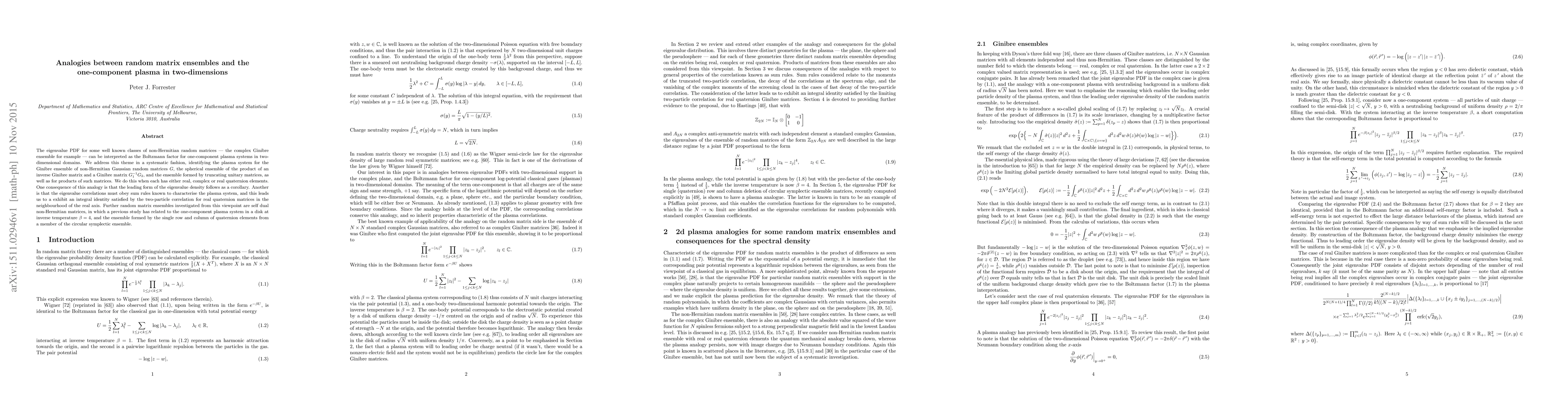 This paper explores analogies between non-Hermitian random matrix ensembles and two-dimensional one-component plasma systems, revealing that the eigenvalue PDFs of certain random matrices correspond to the Boltzmann factors of these plasma systems. It identifies these analogies for various ensembles, including the Ginibre ensemble and products of inverse Ginibre matrices, and derives integral identities for the two-particle correlations in real quaternion matrices.