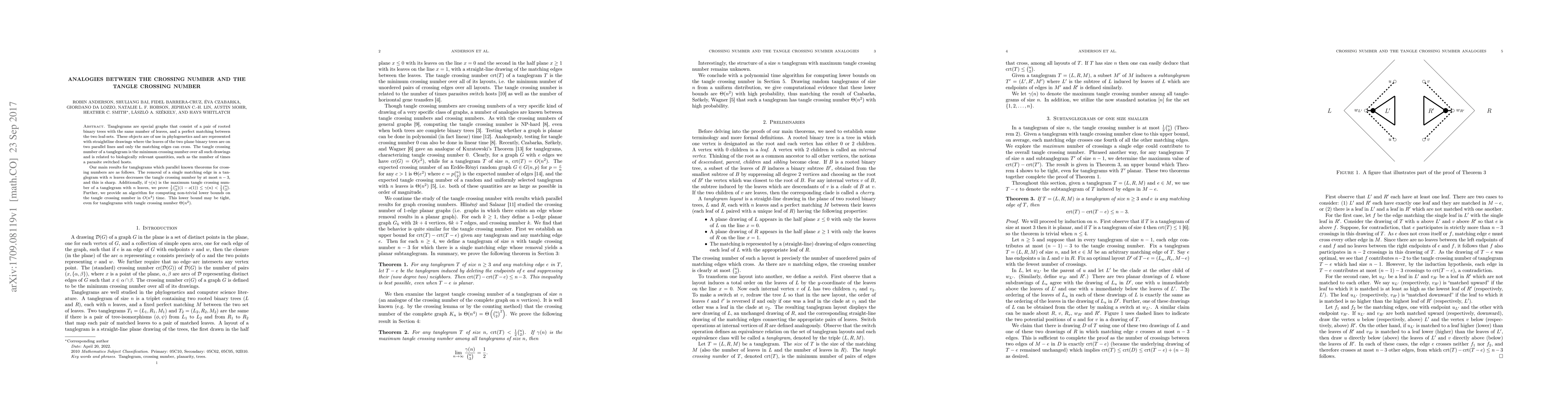 The research establishes analogies between the crossing number and the tangle crossing number using tanglegrams, which are graphs consisting of a pair of rooted binary trees with a perfect matching between their leaf sets. It employs mathematical proofs and algorithmic constructions to demonstrate these analogies.