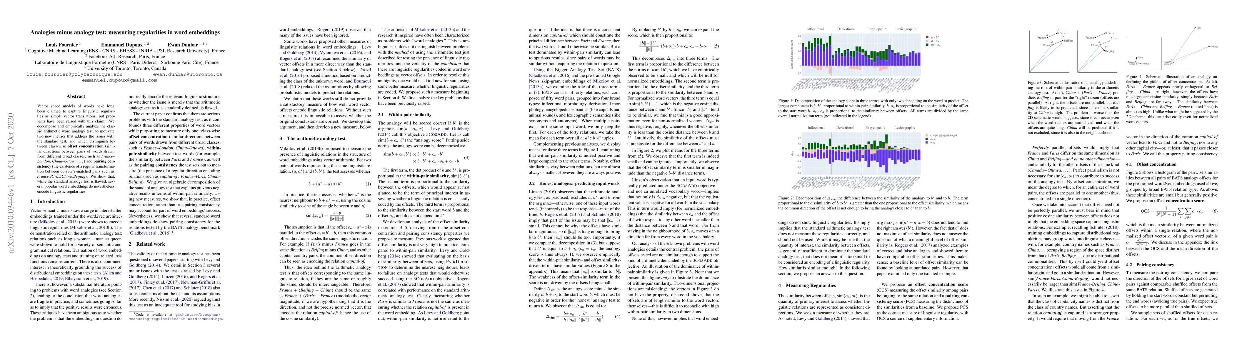 Vector space models of words have long been claimed to capture linguistic regularities as simple vector translations, but problems have been raised with this claim. We decompose and empirically analyze the classic arithmetic word analogy test, to motivate two new metrics that address the issues with the standard test, and which distinguish between class-wise offset concentration (similar directions between pairs of words drawn from different broad classes, such as France--London, China--Ottawa, ...) and pairing consistency (the existence of a regular transformation between correctly-matched pairs such as France:Paris::China:Beijing). We show that, while the standard analogy test is flawed, several popular word embeddings do nevertheless encode linguistic regularities.