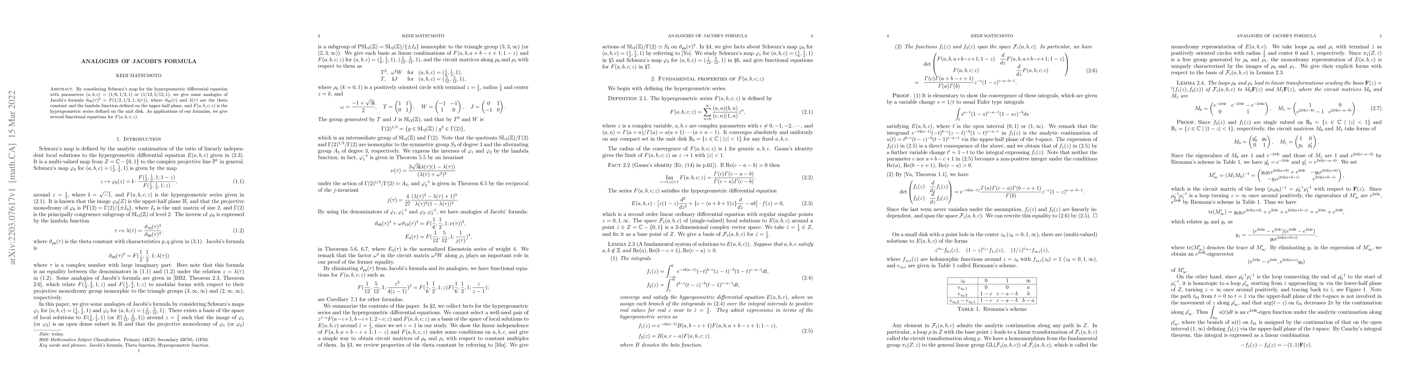 The research presents new analogies of Jacobi's formula, extending previous work by considering Schwarz's map with different parameter sets and deriving functional equations for the hypergeometric series, which were not previously established.