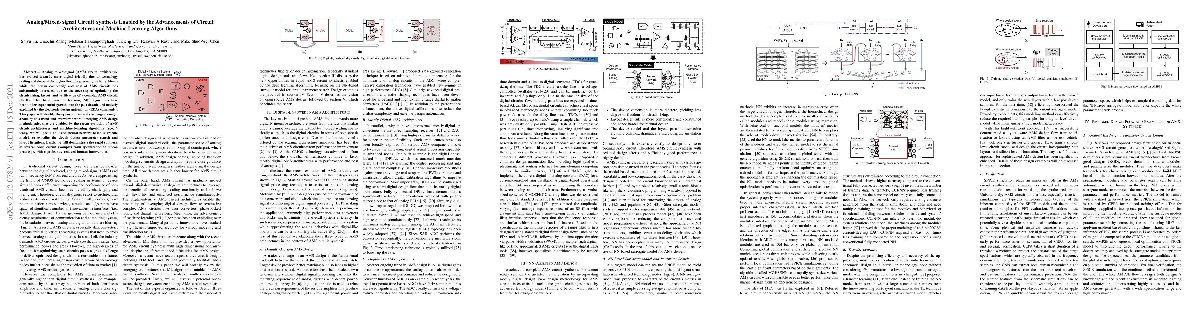 This paper explores how advancements in analog/mixed-signal circuit architecture and machine learning algorithms are revolutionizing AMS circuit synthesis, focusing on neural-network-based models to speed up design processes and reduce human intervention. It highlights emerging methodologies and demonstrates their application through synthesized AMS circuit examples.