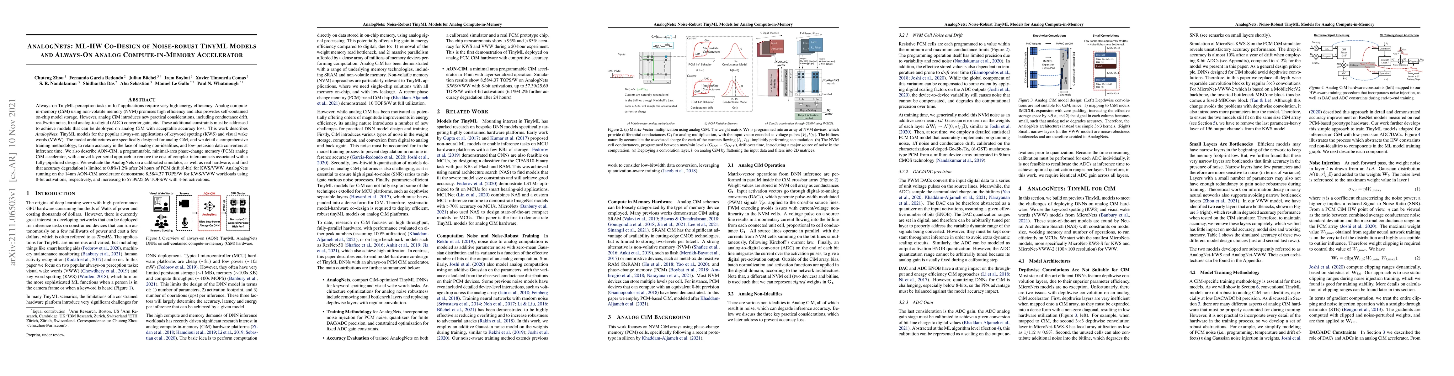AnalogNets presents TinyML models co-designed with an always-on analog compute-in-memory accelerator to achieve high energy efficiency for IoT applications, addressing accuracy loss due to analog non-idealities. The AON-CiM accelerator uses phase-change memory with a layer-serial approach, achieving up to 57.39 TOPS/W for keyword spotting.