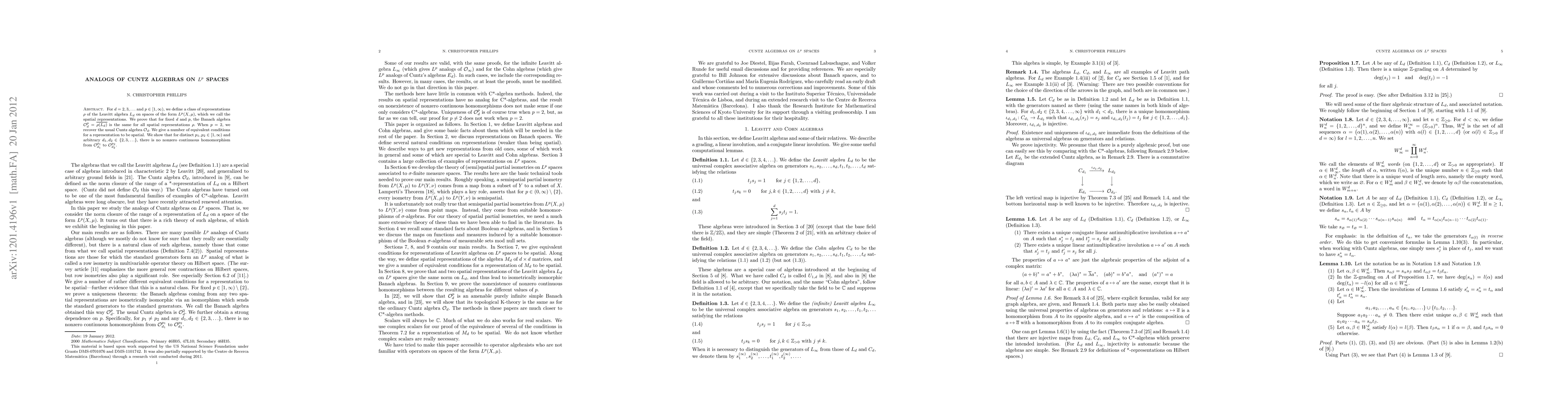 For $d = 2, 3, \ldots$ and $p \in [1, \infty),$ we define a class of representations $\rho$ of the Leavitt algebra $L_d$ on spaces of the form $L^p (X, \mu),$ which we call the spatial representations. We prove that for fixed $d$ and $p,$ the Banach algebra ${{\mathcal{O}}_{d}^{p}}$ obtained as the closure of the image of $L_d$ under the representation $\rho$ is the same for all spatial representations $\rho.$ When $p = 2,$ we recover the usual Cuntz algebra ${\mathcal{O}}_{d}.$ We give a number of equivalent conditions for a representation to be spatial. We show that for distinct $p_1$ and $p_2$ in $[1, \infty)$ and arbitrary $d_1$ and $d_2$ in $\{ 2, 3, \ldots \},$ there is no nonzero continuous homomorphism from ${\mathcal{O}}_{d_1}^{p_1}$ to ${\mathcal{O}}_{d_2}^{p_2}.$