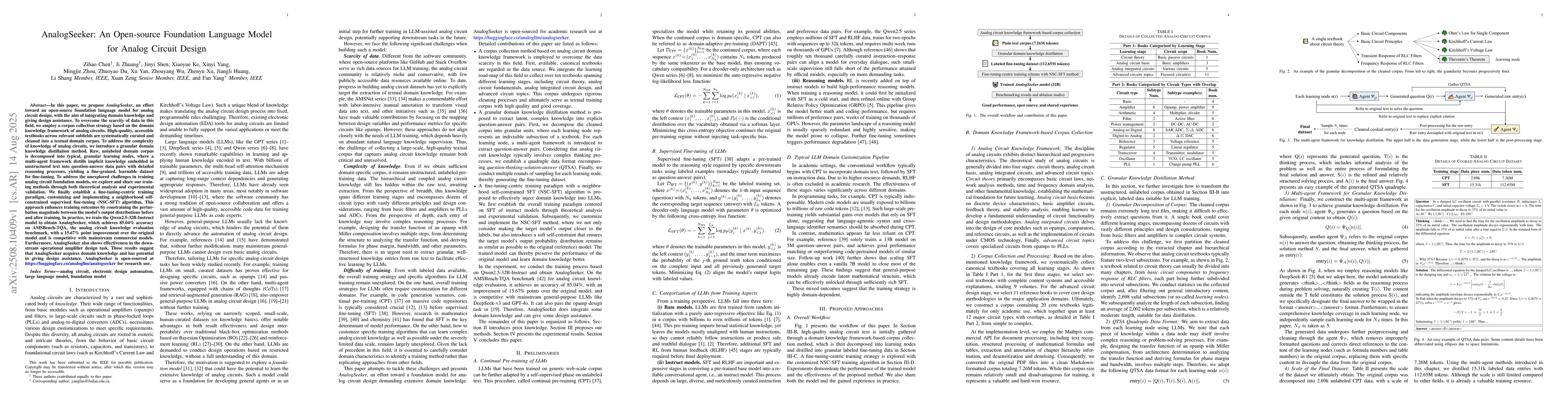 The paper proposes AnalogSeeker, an open-source foundation language model for analog circuit design, utilizing a corpus collection strategy based on domain knowledge. It distills granular learning nodes from unstructured text into question-answer pairs, yielding a fine-grained dataset for fine-tuning. A neighborhood self-constrained supervised fine-tuning (NSC-SFT) algorithm is implemented for training.