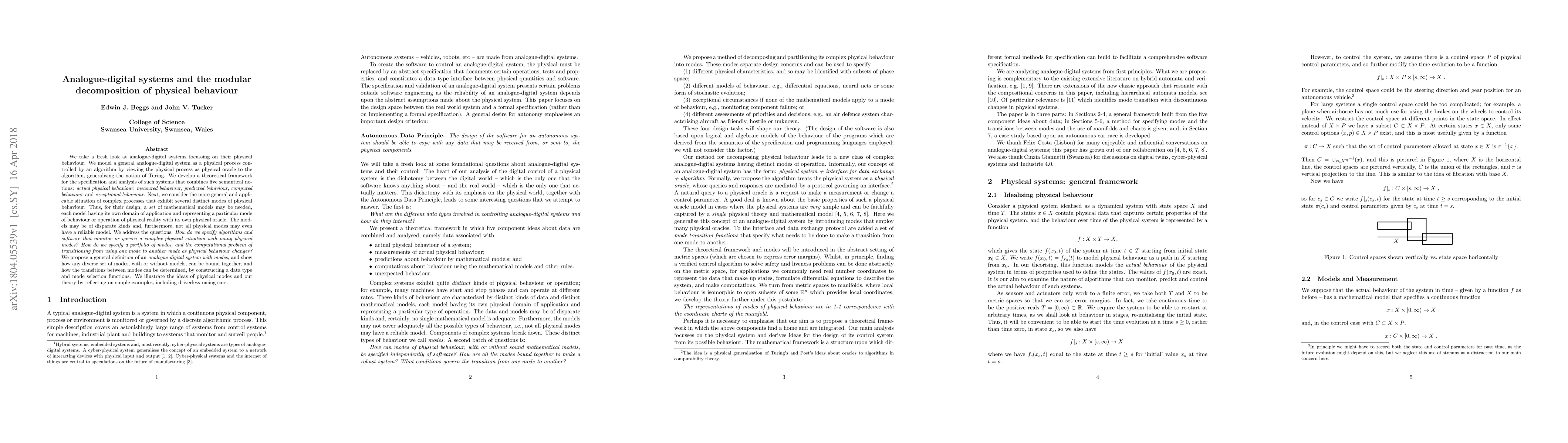 We take a fresh look at analogue-digital systems focussing on their physical behaviour. We model a general analogue-digital system as a physical process controlled by an algorithm by viewing the physical process as physical oracle to the algorithm, generalising the notion of Turing. We develop a theoretical framework for the specification and analysis of such systems that combines five semantical notions: actual physical behaviour, measured behaviour, predicted behaviour, computed behaviour and exceptional behaviour. Next, we consider the more general and applicable situation of complex processes that exhibit several distinct modes of physical behaviour. Thus, for their design, a set of mathematical models may be needed, each model having its own domain of application and representing a particular mode of behaviour or operation of physical reality with its own physical oracle. The models may be of disparate kinds and, furthermore, not all physical modes may even have a reliable model. We address the questions: How do we specify algorithms and software that monitor or govern a complex physical situation with many physical modes? How do we specify a portfolio of modes, and the computational problem of transitioning from using one mode to another mode as physical behaviour changes? We propose a general definition of an analogue-digital system with modes, and show how any diverse set of modes, with or without models, can be bound together, and how the transitions between modes can be determined, by constructing a data type and mode selection functions. We illustrate the ideas of physical modes and our theory by reflecting on simple examples, including driverless racing cars.