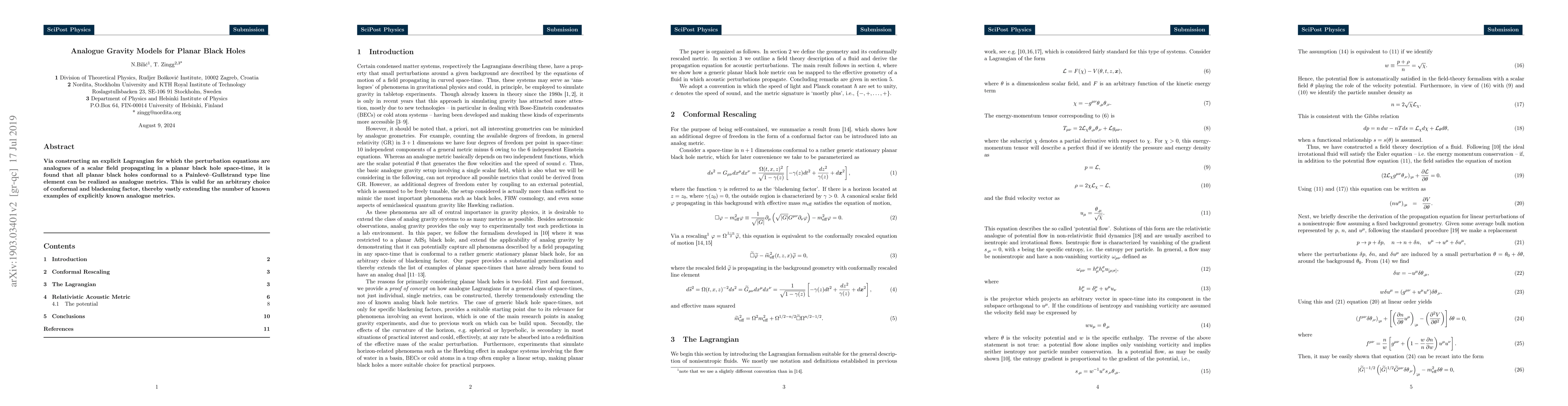 Via constructing an explicit Lagrangian for which the perturbation equations are analogues of a scalar field propagating in a planar black hole space-time, it is found that all planar black holes conformal to a Painlev\'e-Gullstrand type line element can be realized as analogue metrics. This is valid for an arbitrary choice of conformal and blackening factor, thereby vastly extending the number of known examples of explicitly known analogue metrics.