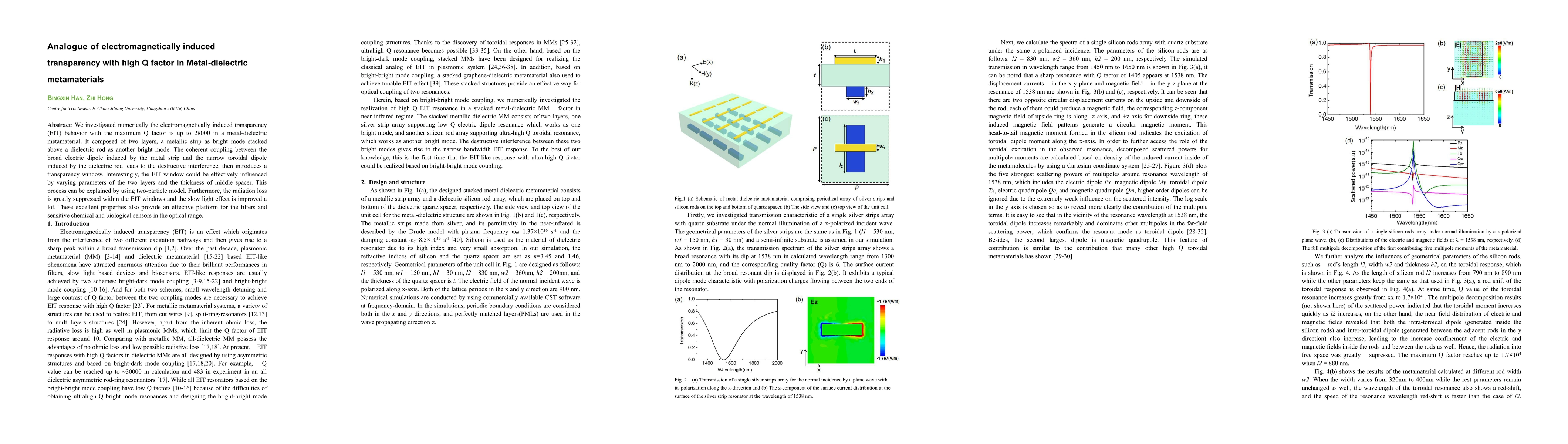 This paper numerically explores electromagnetically induced transparency (EIT) in metal-dielectric metamaterials, achieving a high Q factor of up to 28,000. The structure features a metallic strip above a dielectric rod, where coherent coupling results in destructive interference and a transparency window, significantly suppressing radiation loss and enhancing slow light effects, useful for filters and sensors.