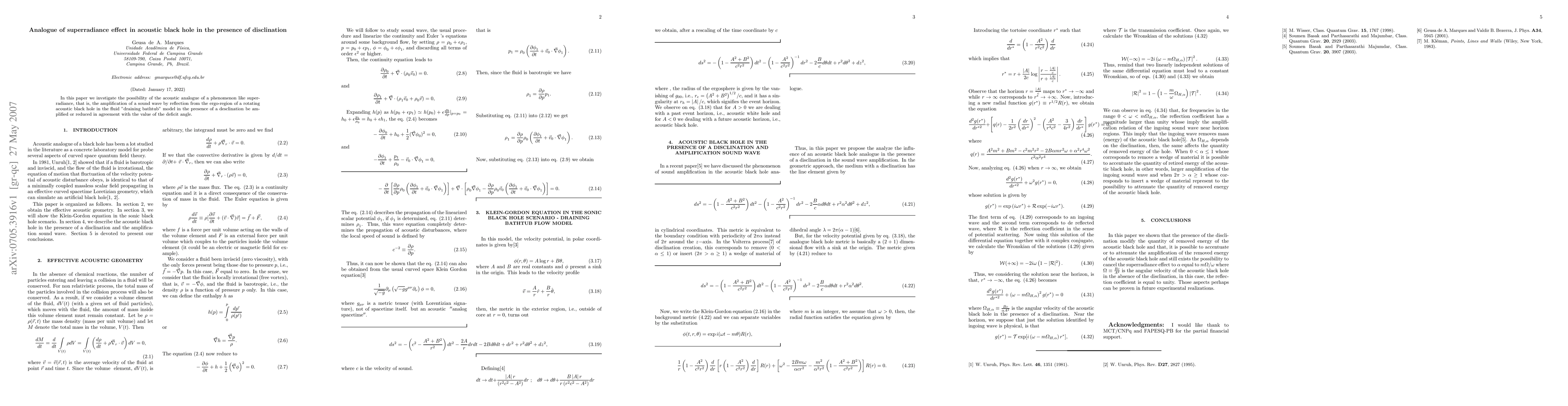 In this paper we invstigate the possibility of the acoustic analogue of a phenomenon like superradiance, that is, the amplification of a sound wave by reflection from the ergo-region of a rotating acoustic black hole in the fluid "draining bathtub" model in the presence of a desclination be amplified or reduced in agreement with the value of the deficit angle.