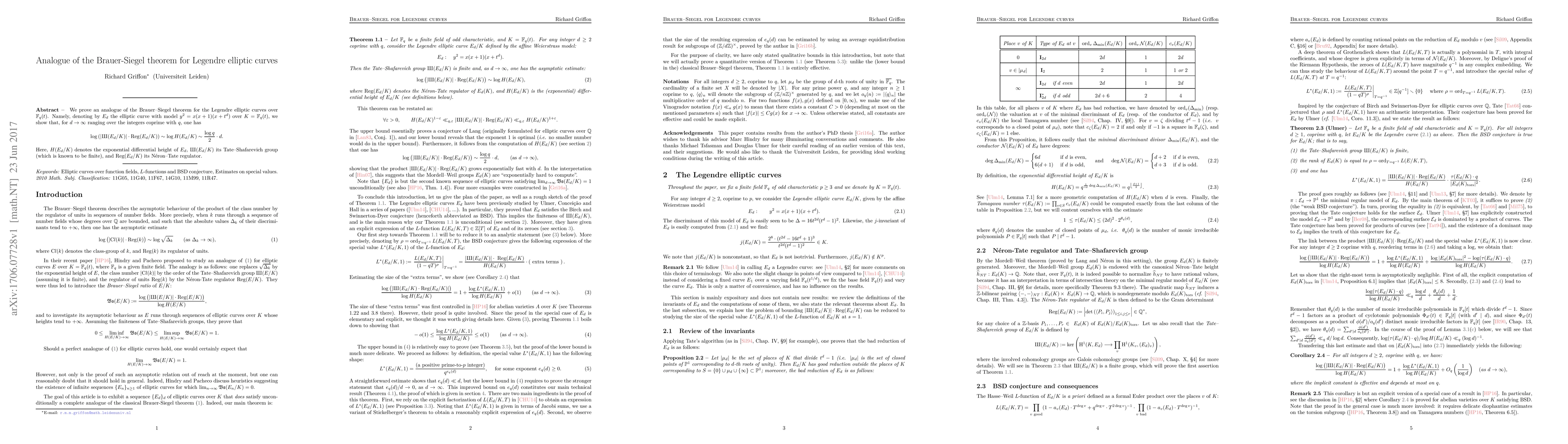 This paper proves an analogue of the Brauer-Siegel theorem for Legendre elliptic curves over $\mathbb{F}_q(t)$, providing an asymptotic estimate for the product of the order of the Tate-Shafarevich group and its Néron-Tate regulator in terms of the exponential differential height as $d$ tends to infinity.