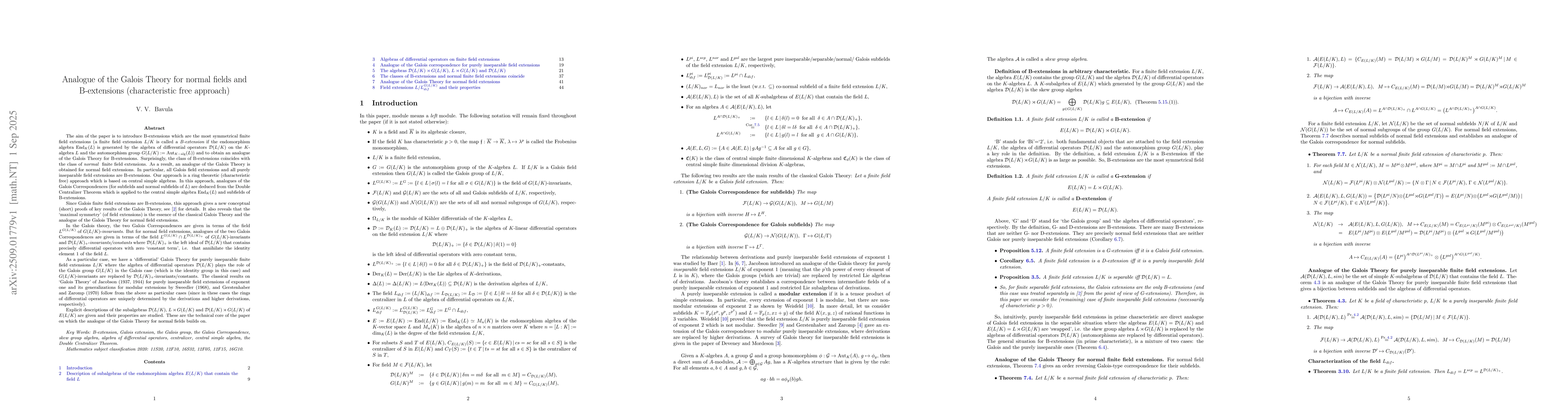 The aim of the paper is to introduce B-extensions which are the most symmetrical finite field extensions (a finite field extension $L/K$ is called a {\it B-extension} if the endomorphism algebra ${\rm End}_K(L)$ is generated by the algebra of differential operators ${\cal D} (L/K)$ on the $K$-algebra $L$ and the automorphism group $G(L/K):={\rm Aut}_{K-{\rm alg}}(L)$) and to obtain an analogue of the Galois Theory for B-extensions. Surprisingly, the class of B-extensions coincides with the class of {\it normal } finite field extensions. As a result, an analogue of the Galois Theory is obtained for normal field extensions. In particular, all Galois field extensions and all purely inseparable field extensions are B-extensions. Our approach is a ring theoretic (characteristic free) approach which is based on central simple algebras. In this approach, analogues of the Galois Correspondences (for subfields and normal subfields of $L$) are deduced from the Double Centralizer Theorem which is applied to the central simple algebra ${\rm End}_K(L)$ and subfields of B-extensions. Since Galois finite field extensions are B-extensions, this approach gives a new conceptual (short) proofs of key results of the Galois Theory, see [2] for details. It also reveals that the `maximal symmetry' (of field extensions) is the essence of the classical Galois Theory and the analogue of the Galois Theory for normal field extensions.