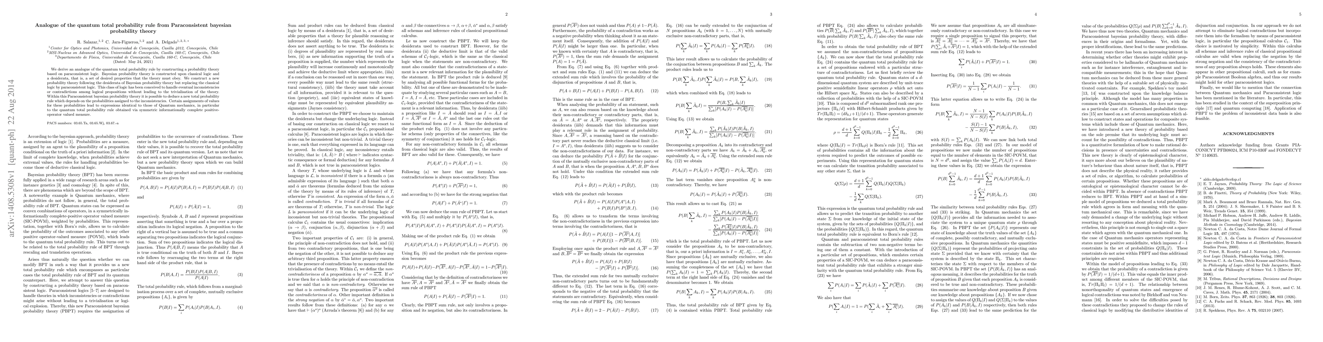 We derive an analogue of the quantum total probability rule by constructing a probability theory based on paraconsistent logic. Bayesian probability theory is constructed upon classical logic and a desiderata, that is, a set of desired properties that the theory must obey. We construct a new probability theory following the desiderata of Bayesian probability theory but replacing the classical logic by paraconsistent logic. This class of logic has been conceived to handle eventual inconsistencies or contradictions among logical propositions without leading to the trivialisation of the theory. Within this Paraconsistent bayesian probability theory it is possible to deduce a new total probability rule which depends on the probabilities assigned to the inconsistencies. Certain assignments of values for these probabilities lead to expressions identical to those of Quantum mechanics, in particular to the quantum total probability rule obtained via symmetric informationally complete positive- operator valued measure.