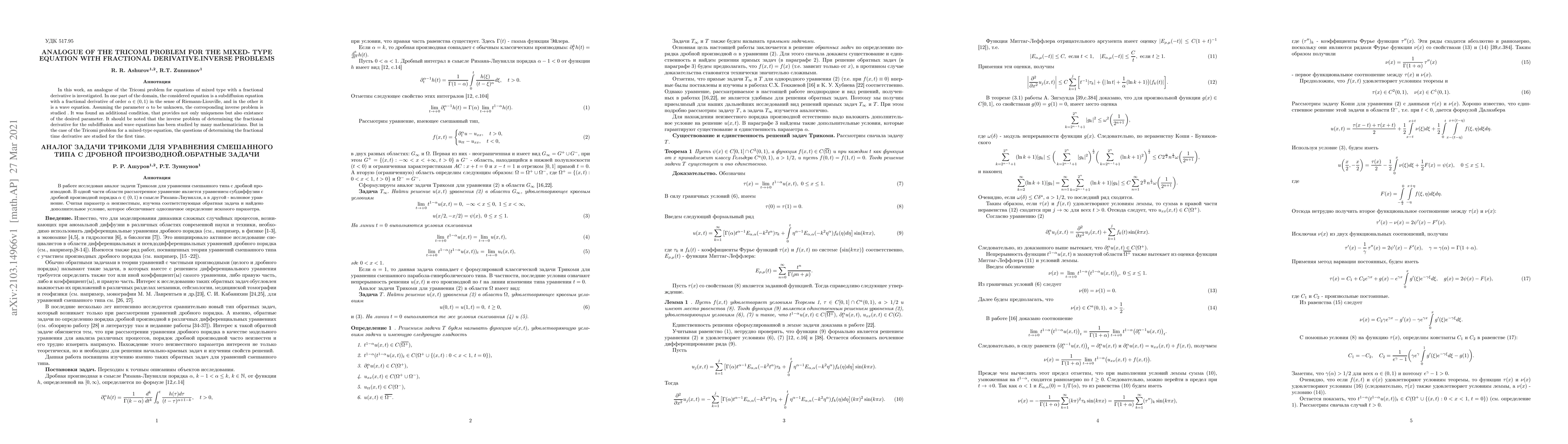 This paper investigates an analogue of the Tricomi problem for mixed-type equations incorporating fractional derivatives, distinguishing between subdiffusion and wave equations in different domains. It introduces an inverse problem for determining an unknown fractional derivative parameter, establishing a condition for both uniqueness and existence of the parameter.