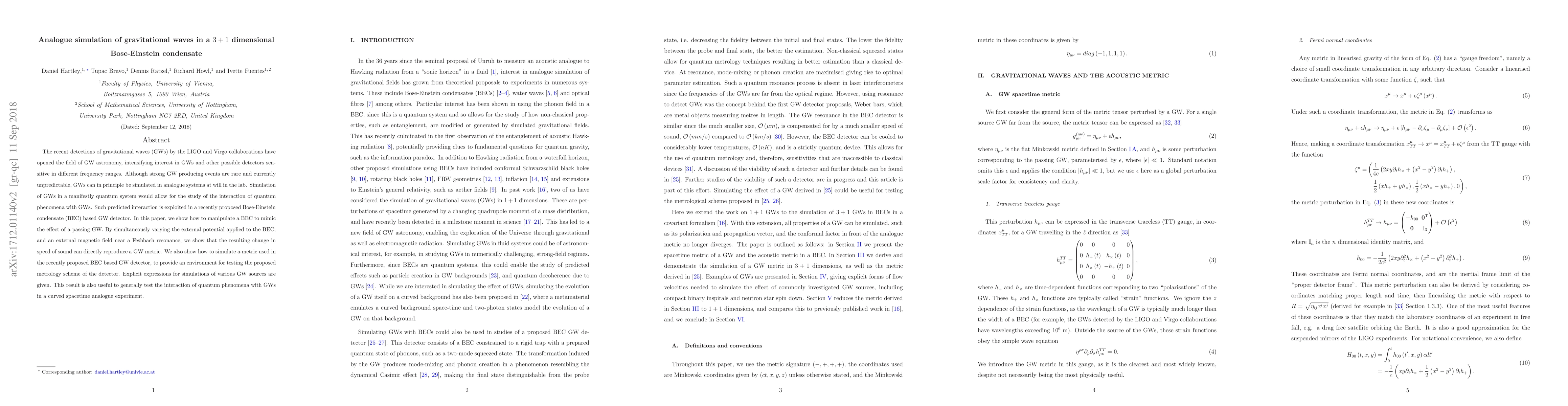 The recent detections of gravitational waves (GWs) by the LIGO and Virgo collaborations have opened the field of GW astronomy, intensifying interest in GWs and other possible detectors sensitive in different frequency ranges. Although strong GW producing events are rare and currently unpredictable, GWs can in principle be simulated in analogue systems at will in the lab. Simulation of GWs in a manifestly quantum system would allow for the study of the interaction of quantum phenomena with GWs. Such predicted interaction is exploited in a recently proposed Bose-Einstein condensate (BEC) based GW detector. In this paper, we show how to manipulate a BEC to mimic the effect of a passing GW. By simultaneously varying the external potential applied to the BEC, and an external magnetic field near a Feshbach resonance, we show that the resulting change in speed of sound can directly reproduce a GW metric. We also show how to simulate a metric used in the recently proposed BEC based GW detector, to provide an environment for testing the proposed metrology scheme of the detector. Explicit expressions for simulations of various GW sources are given. This result is also useful to generally test the interaction of quantum phenomena with GWs in a curved spacetime analogue experiment.