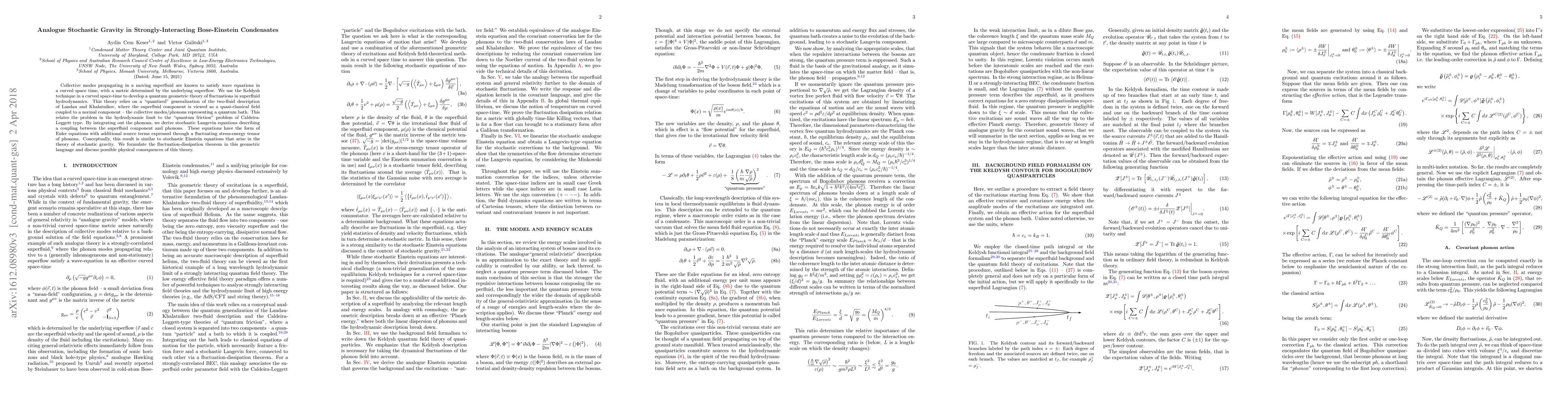 Researchers developed a quantum geometric theory of fluctuations in superfluid hydrodynamics using the Keldysh technique, revealing stochastic Langevin equations that describe the coupling between a superfluid component and phonons, similar to stochastic Einstein equations in gravitational theories.