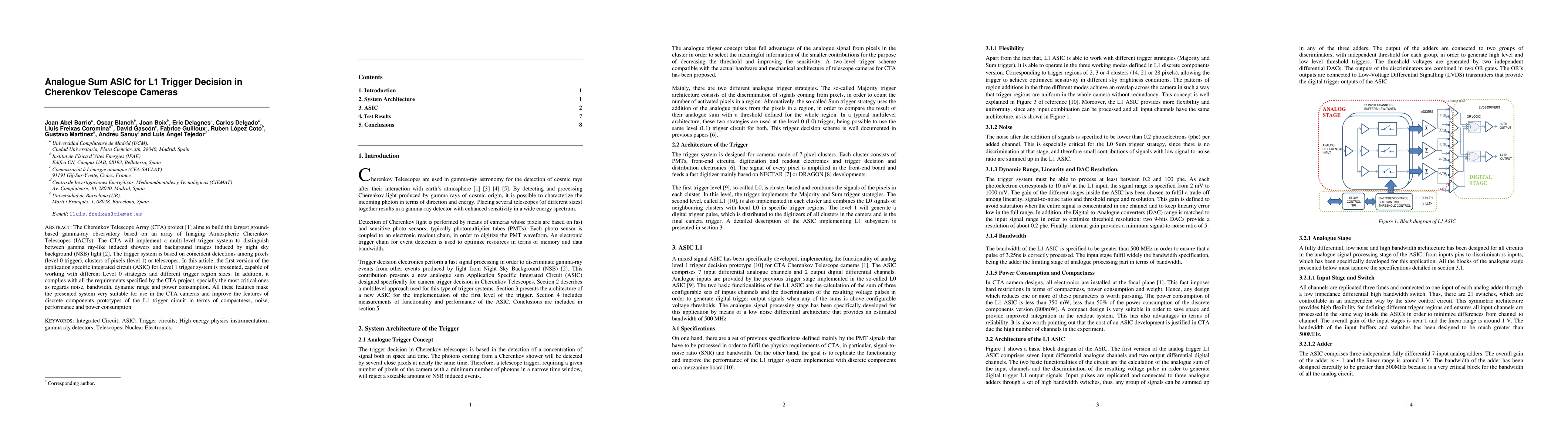 This paper presents an Analogue Sum ASIC designed for the Level 1 trigger decision in Cherenkov Telescope Cameras, crucial for distinguishing gamma rays from background noise in the CTA project. The ASIC meets stringent requirements for noise, bandwidth, dynamic range, and power consumption, enhancing the performance and compactness of the L1 trigger system.
