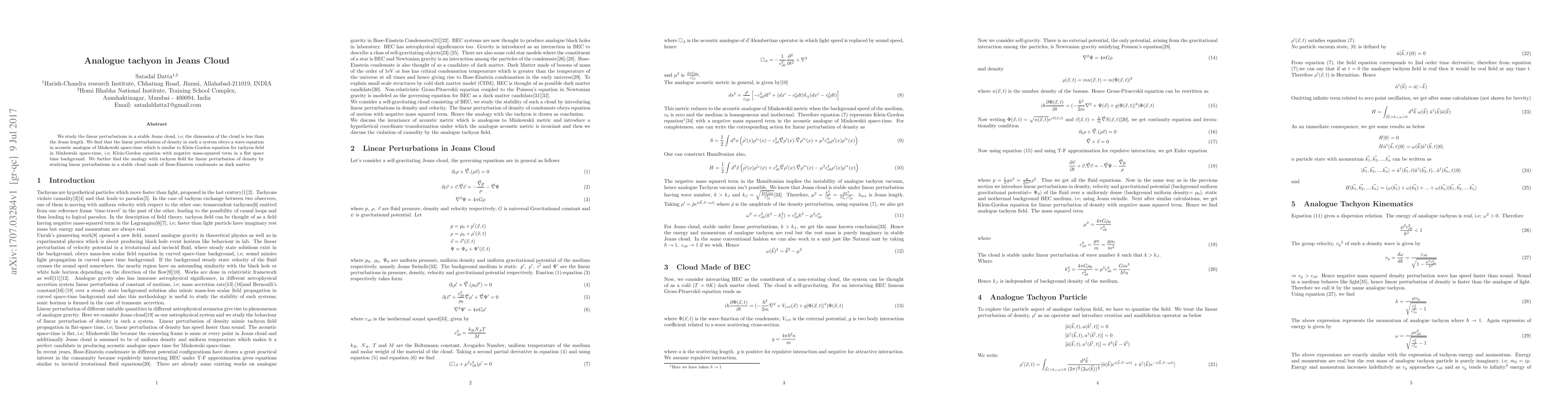 We study the linear perturbations in a stable Jeans cloud, i.e; the dimension of the cloud is less than the Jeans length. We find that the linear perturbation of density in such a system obeys a wave equation in acoustic analogue of Minkowski space-time which is similar to Klein-Gordon equation for tachyon field in Minkowski space-time, i.e; Klein-Gordon equation with negative mass-squared term in a flat space time background. We further find the analogy with tachyon field for linear perturbation of density by studying linear perturbations in a stable cloud made of Bose-Einstein condensate as dark matter.