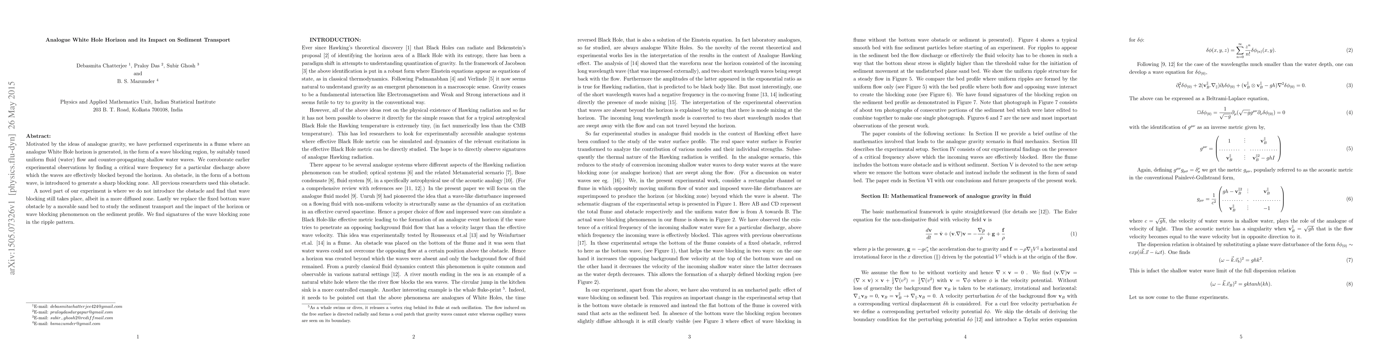 This study explores analogue White Hole horizons in fluid dynamics using a flume experiment, demonstrating wave blocking above a critical frequency. It investigates sediment transport in the presence of a movable sand bed, revealing the impact of wave blocking on ripple patterns, even without a fixed obstacle.