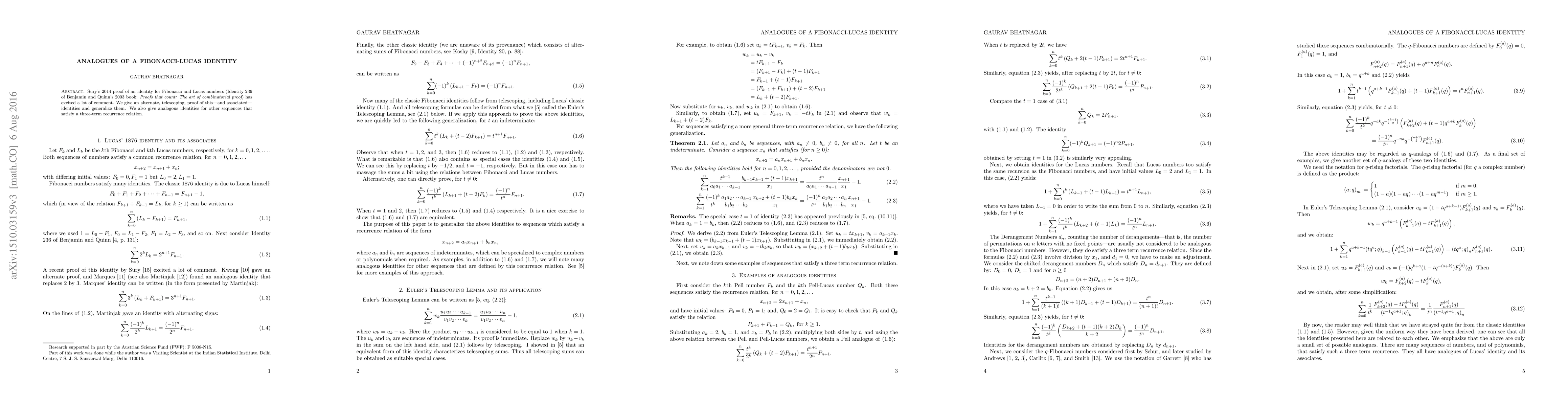 Sury's 2014 proof of an identity for Fibonacci and Lucas numbers (Identity 236 of Benjamin and Quinn's 2003 book: {\em Proofs that count: The art of combinatorial proof}) has excited a lot of comment. We give an alternate, telescoping, proof of this---and associated---identities and generalize them. We also give analogous identities for other sequences that satisfy a three-term recurrence relation.