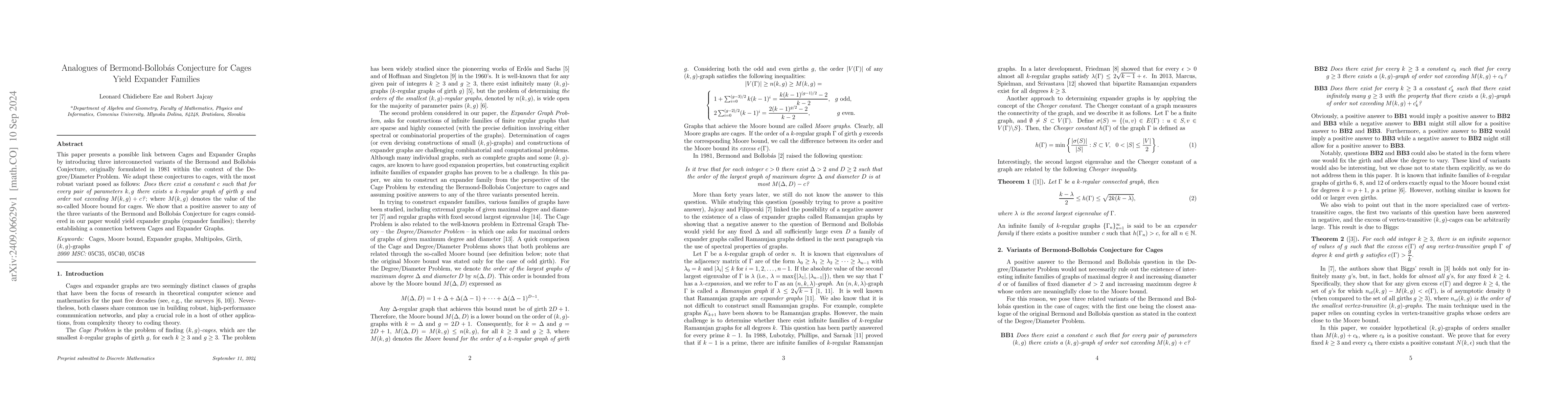 This paper explores the connection between cages and expander graphs by adapting Bermond-Bollobás Conjecture variants for cages. It posits that a positive resolution to any of these conjectures would generate expander graph families, thereby linking these two graph theory concepts.