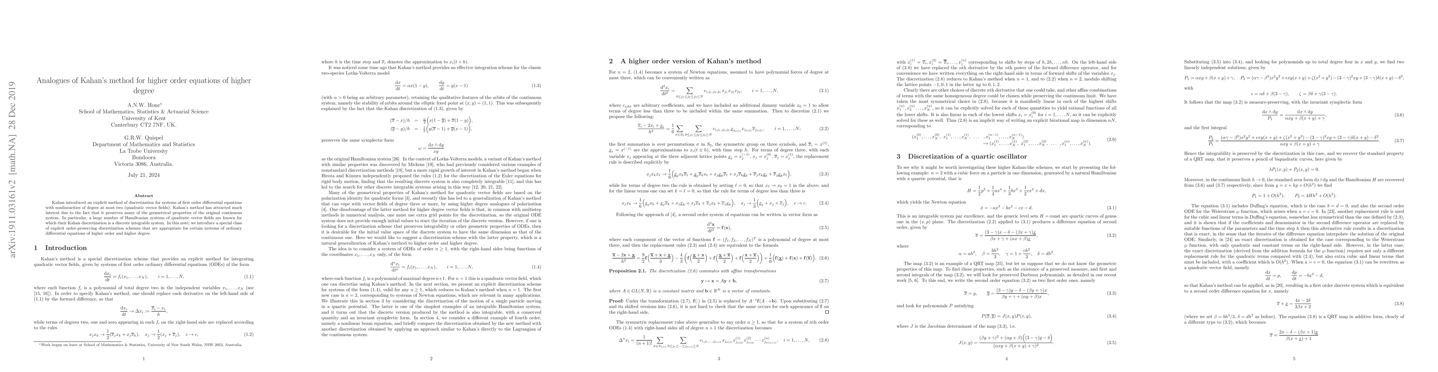 This paper extends Kahan's method to higher order and higher degree nonlinear ordinary differential equations, introducing new explicit discretization schemes that preserve the geometrical properties of the original systems, particularly for Hamiltonian systems. These schemes aim to maintain the integrability of discrete systems derived from quadratic vector fields.