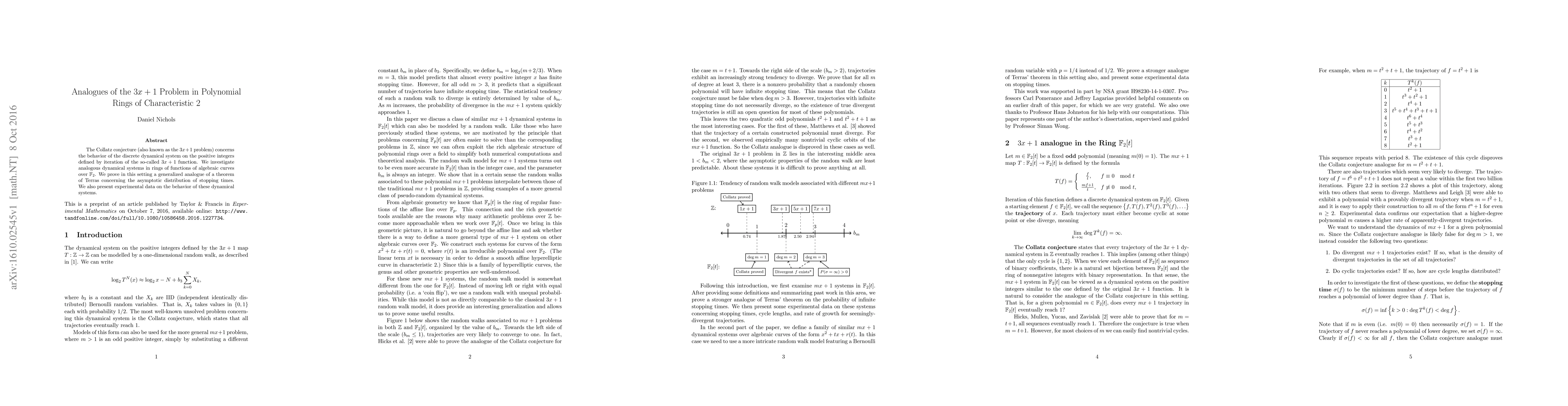 The Collatz conjecture (also known as the $3x+1$ problem) concerns the behavior of the discrete dynamical system on the positive integers defined by iteration of the so-called $3x + 1$ function. We investigate analogous dynamical systems in rings of functions of algebraic curves over $\mathbb{F}_2$ . We prove in this setting a generalized analogue of a theorem of Terras concerning the asymptotic distribution of stopping times. We also present experimental data on the behavior of these dynamical systems.