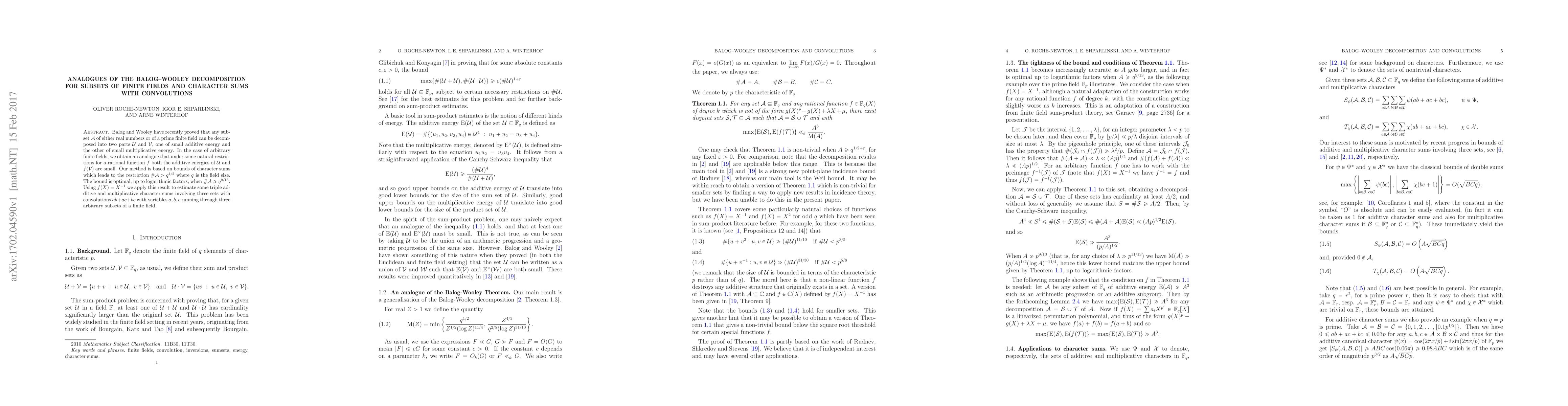 Balog and Wooley have recently proved that any subset $A$ of either real numbers or of a prime finite field can be decomposed into two parts $U$ and $V$, one of small additive energy and the other of small multiplicative energy. In the case of arbitrary finite fields, we obtain an analogue that under some natural restrictions for a rational function $f$ both the additive energies of $U$ and $f(V)$ are small. Our method is based on bounds of character sums which leads to the restriction $\# A > q^{1/2}$ where $q$ is the field size. The bound is optimal, up to logarithmic factors, when $\# A \geq q^{9/13}$. Using $f(X)=X^{-1}$ we apply this result to estimate some triple additive and multiplicative character sums involving three sets with convolutions $ab+ac+bc$ with variables $a,b,c$ running through three arbitrary subsets of a finite field.