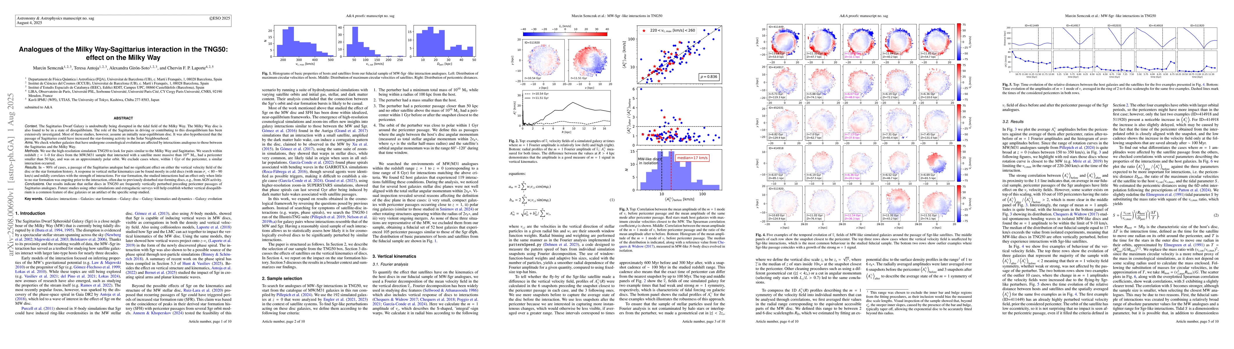 The Sagittarius Dwarf Galaxy is undoubtedly being disrupted in the tidal field of the Milky Way. The Milky Way disc is also found to be in a state of disequilibrium. The role of the Sagittarius in driving or contributing to this disequilibrium has been extensively investigated. Most of these studies, however, assume an initially near-equilibrium disc. It was also hypothesized that the passage of Sagittarius could have increased the star-forming activity in the Solar Neighbourhood. We check whether galaxies that have undergone cosmological evolution are affected by interactions analogous to those between the Sagittarius and the Milky Way. We use the high-resolution simulation TNG50 to look for pairs similar to the Milky Way and Sagittarius. We search within redshift z=1-0 for discs from the MW/M31 sample that interacted with a satellite more massive than 10 billion Msun, had a pericenter smaller than 50 kpc, and was on an approximately polar orbit. We exclude cases where, within 1 Gyr of the pericenter, a similar interaction occurred. In 90 percent of cases, a passage of the Sagittarius analogue had no significant effect on either the vertical velocity field of the disc or the star formation history. A response in vertical stellar kinematics can be found mostly in cold discs and mildly correlates with the strength of interactions. For star formation, the studied interactions had an effect only when little to no star formation was ongoing prior to the interaction, often due to previously disturbed star-forming discs, e.g., from AGN activity. Our results indicate that stellar discs in TNG50 are frequently vertically perturbed preceding pericenter passages of Sagittarius analogues. Future studies using other simulations and extragalactic surveys will help establish whether vertical disequilibrium is a common feature of disc galaxies or an artifact of the specific setup studied.