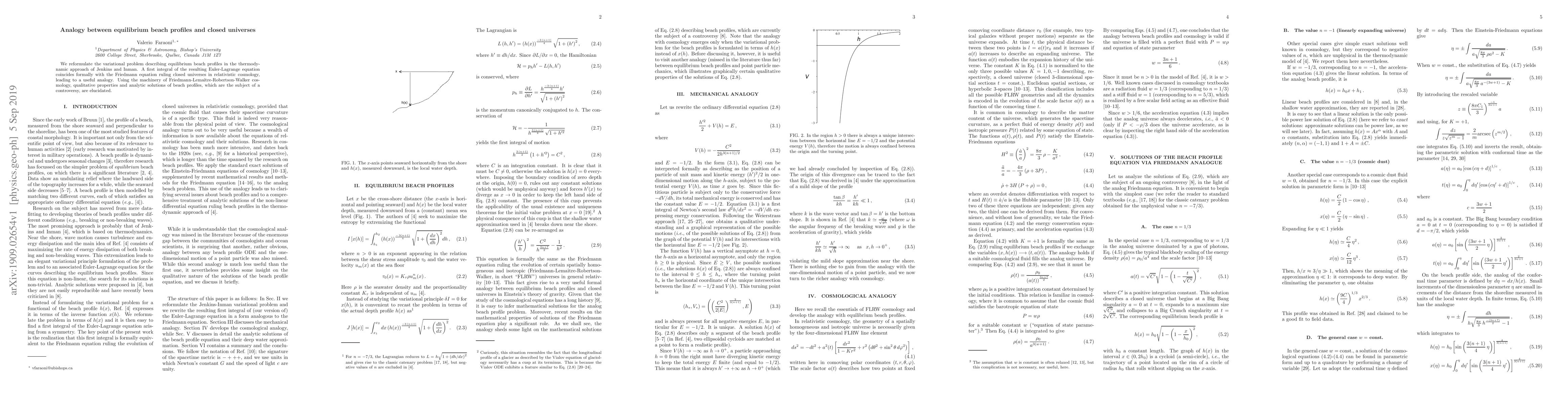 We reformulate the variational problem describing equilibrium beach profiles in the thermodynamic approach of Jenkins and Inman. A first integral of the resulting Euler-Lagrange equation coincides formally with the Friedmann equation ruling closed universes in relativistic cosmology, leading to a useful analogy. Using the machinery of Friedmann-Lema\^{\i}tre-Robertson-Walker cosmology, qualitative properties and analytic solutions of beach profiles, which are the subject of a controversy, are elucidated.