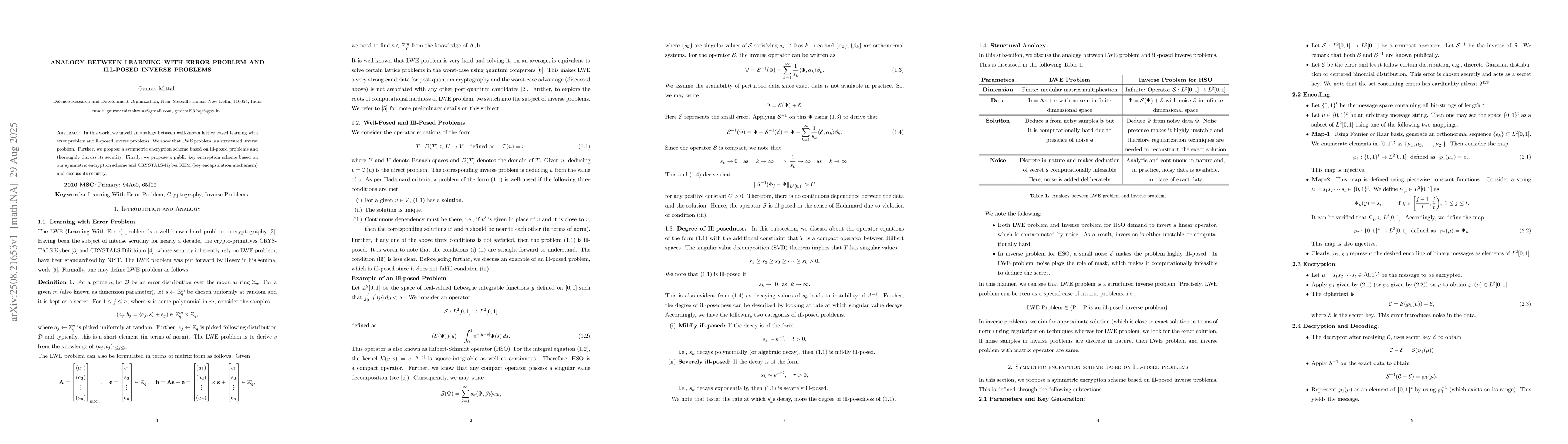 In this work, we unveil an analogy between well-known lattice based learning with error problem and ill-posed inverse problems. We show that LWE problem is a structured inverse problem. Further, we propose a symmetric encryption scheme based on ill-posed problems and thoroughly discuss its security. Finally, we propose a public key encryption scheme based on our symmetric encryption scheme and CRYSTALS-Kyber KEM (key encapsulation mechanism) and discuss its security.