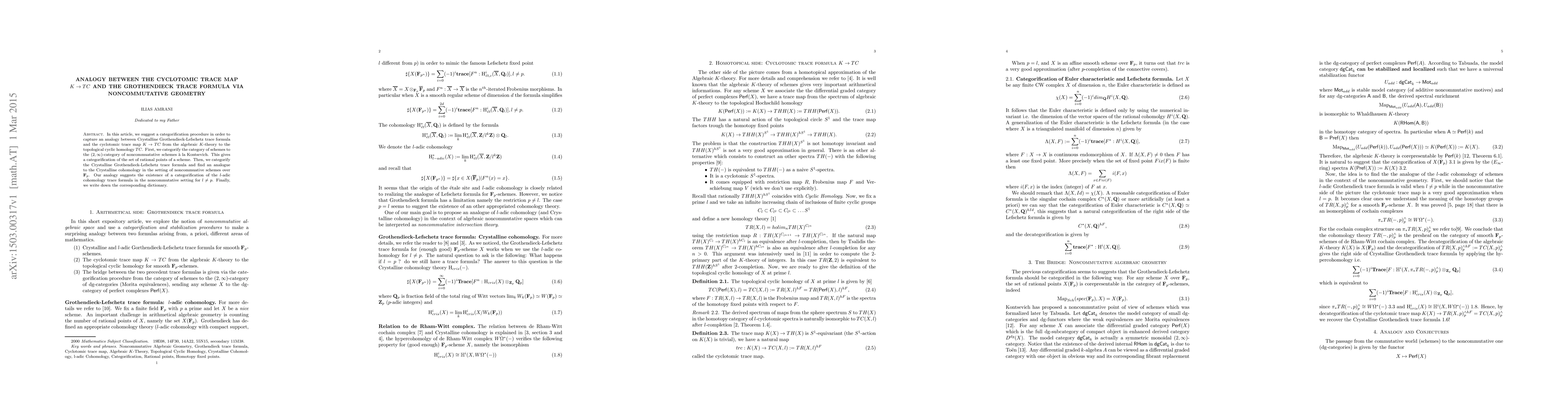 In this article, we suggest a categorification procedure in order to capture an analogy between Crystalline Grothendieck-Lefschetz trace formula and the cyclotomic trace map $K\rightarrow TC$ from the algebraic $K$-theory to the topological cyclic homology $TC$. First, we categorify the category of schemes to the $(2, \infty)$-category of noncommuatative schemes a la Kontsevich. This gives a categorification of the set of rational points of a scheme. Then, we categorify the Crystalline Grothendieck-Lefschetz trace formula and find an analogue to the Crystalline cohomology in the setting of noncommuative schemes over $\mathbf{F}_{p}$. Our analogy suggests the existence of a categorification of the $l$-adic cohomology trace formula in the noncommutative setting for $l\neq p$. Finally, we write down the corresponding dictionary.