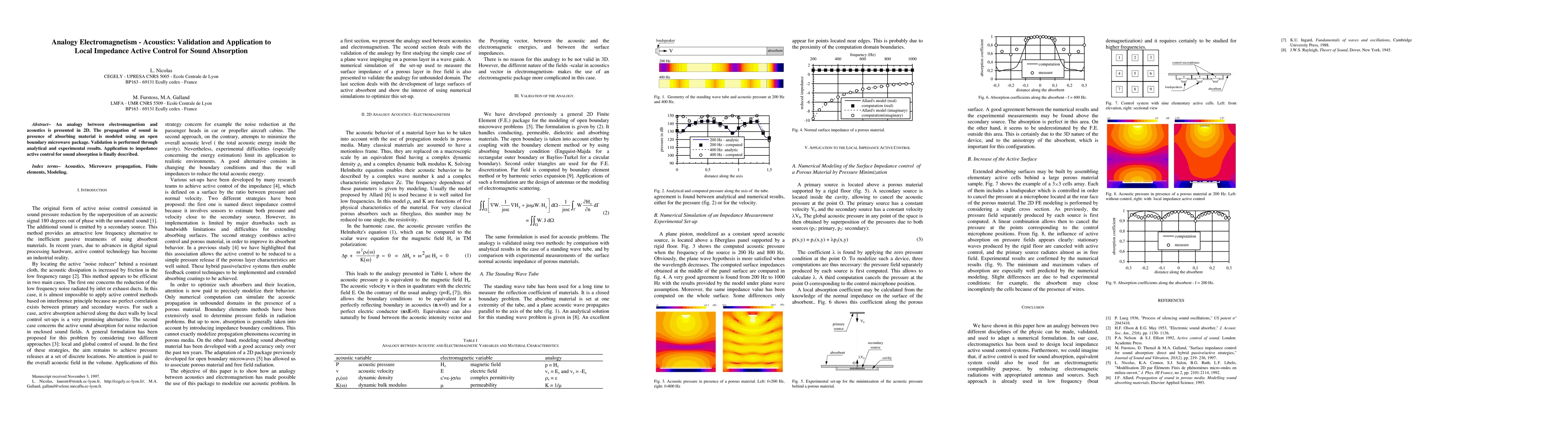 This paper establishes a 2D analogy between electromagnetism and acoustics to model sound propagation with absorbing materials, validated via analytical and experimental results. It applies this analogy to local impedance active control for enhancing free field sound absorption.