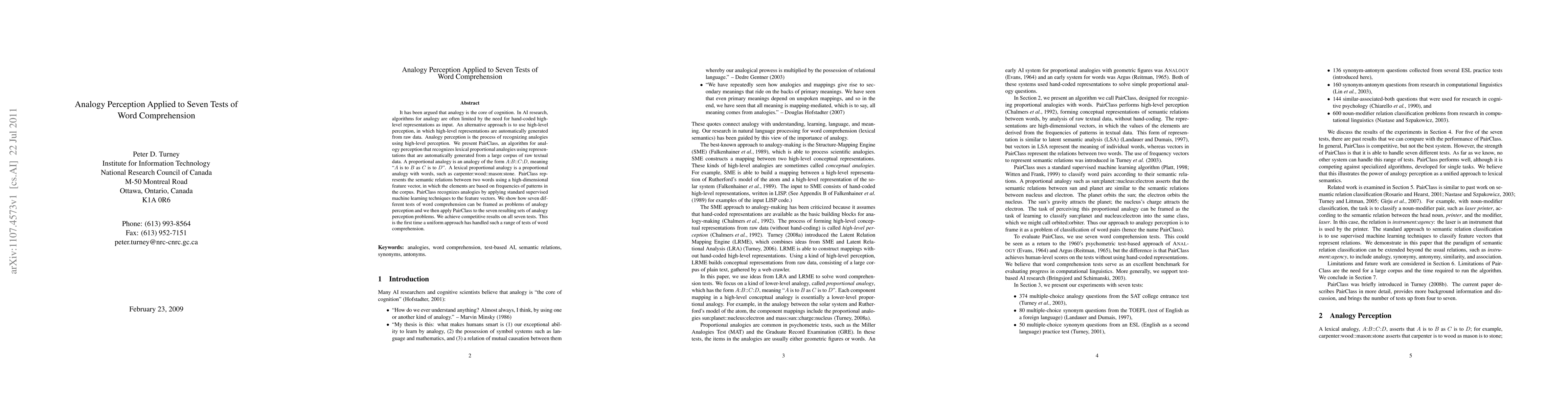 It has been argued that analogy is the core of cognition. In AI research, algorithms for analogy are often limited by the need for hand-coded high-level representations as input. An alternative approach is to use high-level perception, in which high-level representations are automatically generated from raw data. Analogy perception is the process of recognizing analogies using high-level perception. We present PairClass, an algorithm for analogy perception that recognizes lexical proportional analogies using representations that are automatically generated from a large corpus of raw textual data. A proportional analogy is an analogy of the form A:B::C:D, meaning "A is to B as C is to D". A lexical proportional analogy is a proportional analogy with words, such as carpenter:wood::mason:stone. PairClass represents the semantic relations between two words using a high-dimensional feature vector, in which the elements are based on frequencies of patterns in the corpus. PairClass recognizes analogies by applying standard supervised machine learning techniques to the feature vectors. We show how seven different tests of word comprehension can be framed as problems of analogy perception and we then apply PairClass to the seven resulting sets of analogy perception problems. We achieve competitive results on all seven tests. This is the first time a uniform approach has handled such a range of tests of word comprehension.