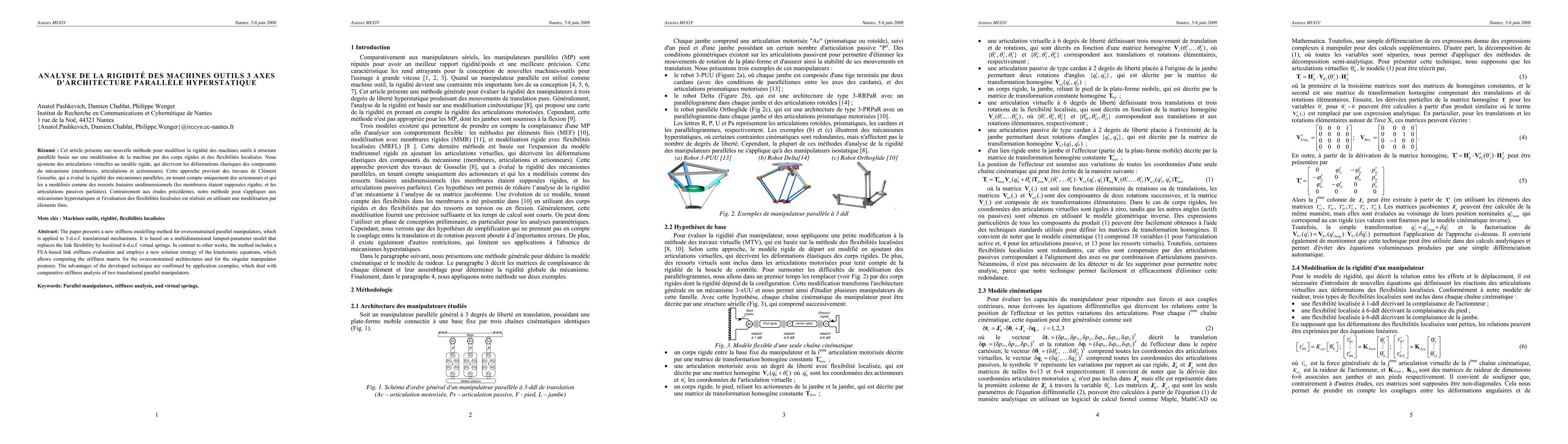 The paper presents a new stiffness modelling method for overconstrained parallel manipulators, which is applied to 3-d.o.f. translational mechanisms. It is based on a multidimensional lumped-parameter model that replaces the link flexibility by localized 6-d.o.f. virtual springs. In contrast to other works, the method includes a FEA-based link stiffness evaluation and employs a new solution strategy of the kinetostatic equations, which allows computing the stiffness matrix for the overconstrained architectures and for the singular manipulator postures. The advantages of the developed technique are confirmed by application examples, which deal with comparative stiffness analysis of two translational parallel manipulators.