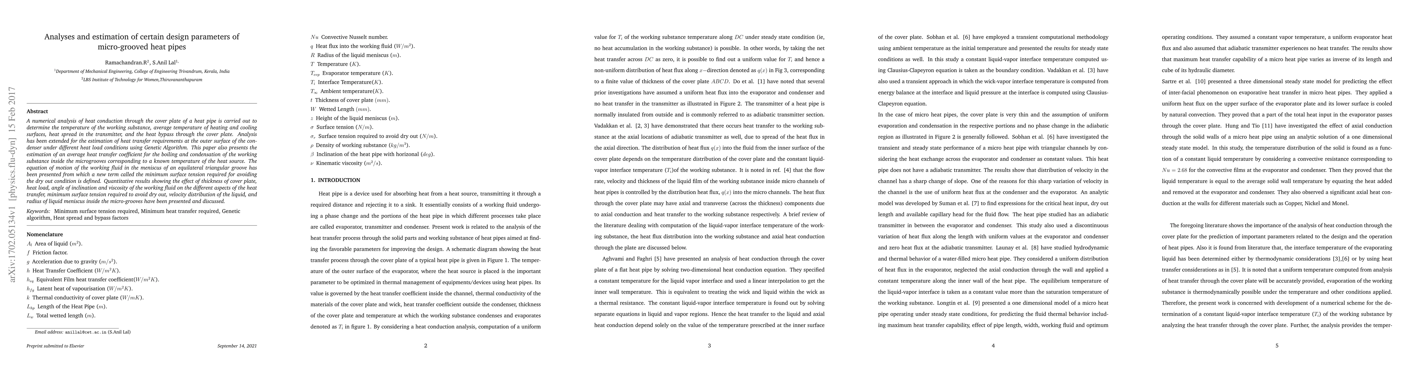A numerical analysis of heat conduction through the cover plate of a heat pipe is carried out to determine the temperature of the working substance, average temperature of heating and cooling surfaces, heat spread in the transmitter, and the heat bypass through the cover plate. Analysis has been extended for the estimation of heat transfer requirements at the outer surface of the con- denser under different heat load conditions using Genetic Algorithm. This paper also presents the estimation of an average heat transfer coefficient for the boiling and condensation of the working substance inside the microgrooves corresponding to a known temperature of the heat source. The equation of motion of the working fluid in the meniscus of an equilateral triangular groove has been presented from which a new term called the minimum surface tension required for avoiding the dry out condition is defined. Quantitative results showing the effect of thickness of cover plate, heat load, angle of inclination and viscosity of the working fluid on the different aspects of the heat transfer, minimum surface tension required to avoid dry out, velocity distribution of the liquid, and radius of liquid meniscus inside the micro-grooves have been presented and discussed.
