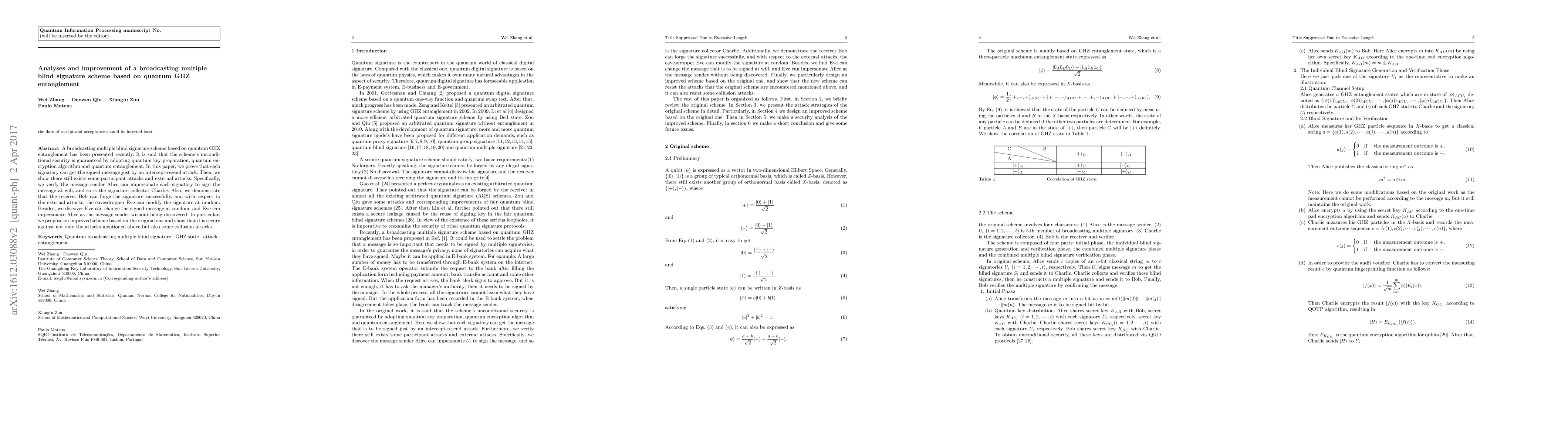 This paper analyzes and improves a broadcasting multiple blind signature scheme based on quantum GHZ entanglement, revealing several vulnerabilities including intercept-resend, participant, and external attacks. An enhanced scheme is proposed to address these issues and provide security against collusion attacks.