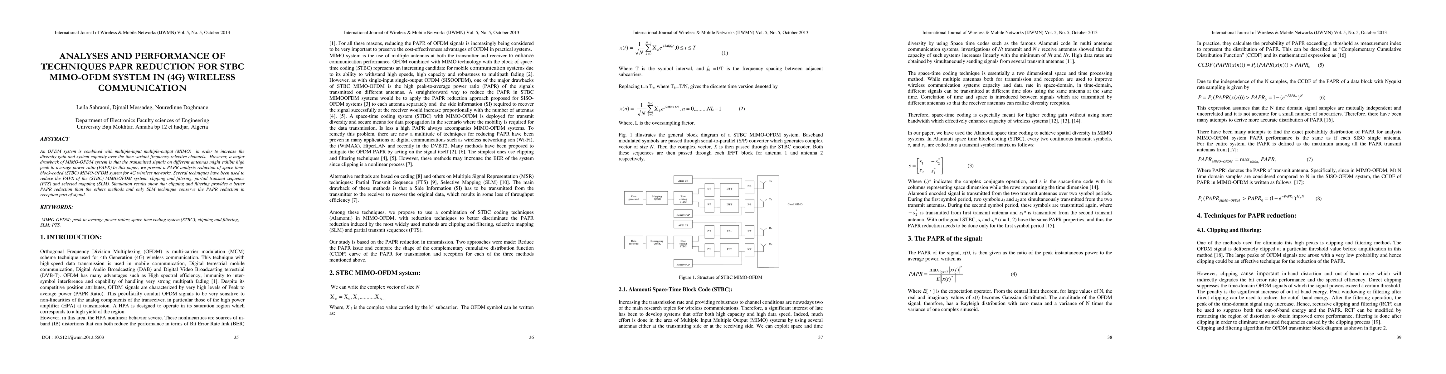 This paper analyzes and compares techniques for reducing PAPR in STBC MIMO-OFDM systems used in 4G wireless communication. It evaluates clipping and filtering, PTS, and SLM, finding that clipping and filtering offers superior PAPR reduction, while SLM maintains PAPR reduction during signal reception.