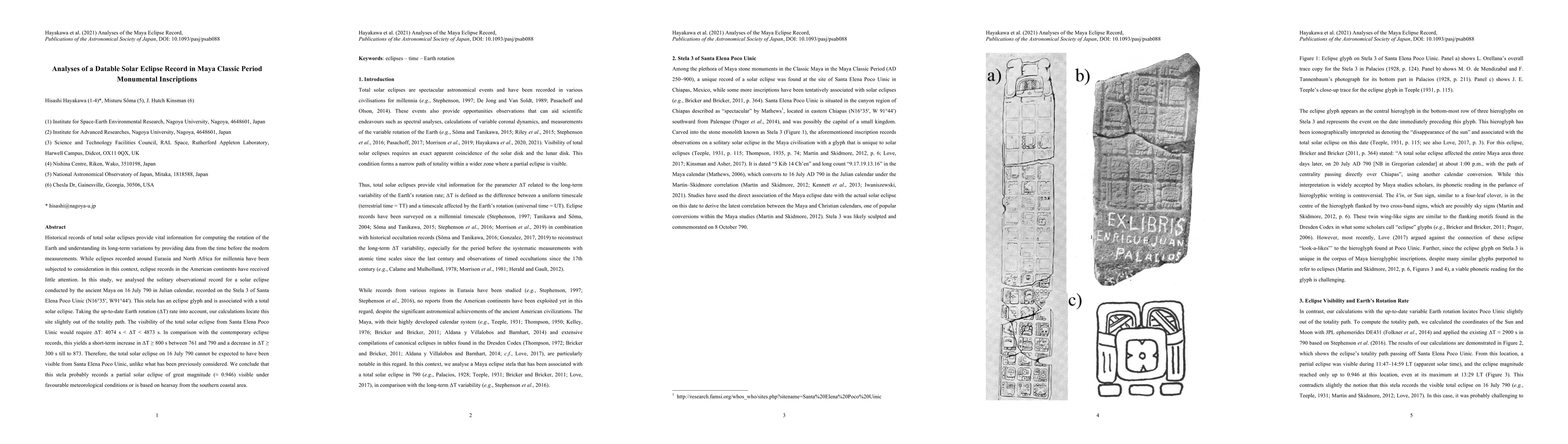Historical records of total solar eclipses provide vital information for computing the rotation of the Earth and understanding its long-term variations by providing data from the time before the modern measurements. While eclipses recorded around Eurasia and North Africa for millennia have been subjected to consideration in this context, eclipse records in the American continents have received little attention. In this study, we analysed the solitary observational record for a solar eclipse conducted by the ancient Maya on 16 July 790 in Julian calendar, recorded on the Stela 3 of Santa Elena Poco Uinic (N16{\deg}35', W91{\deg}44'). This stela has an eclipse glyph and is associated with a total solar eclipse. Taking the up-to-date Earth rotation ({\Delta}T) rate into account, our calculations locate this site slightly out of the totality path. The visibility of the total solar eclipse from Santa Elena Poco Uinic would require {\Delta}T: 4074 s < {\Delta}T < 4873 s. In comparison with the contemporary eclipse records, this yields a short-term increase in {\Delta}T >= 800 s between 761 and 790 and a decrease in {\Delta}T >= 300 s till to 873. Therefore, the total solar eclipse on 16 July 790 cannot be expected to have been visible from Santa Elena Poco Uinic, unlike what has been previously considered. We conclude that this stela probably records a partial solar eclipse of great magnitude (~ 0.946) visible under favourable meteorological conditions or is based on hearsay from the southern coastal area.