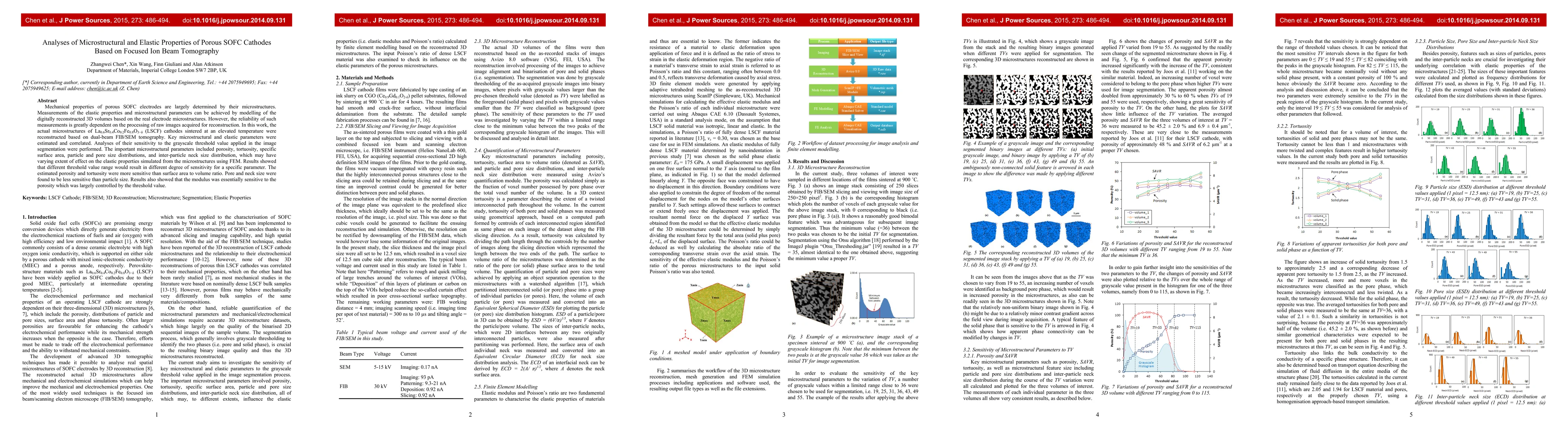 This study reconstructs the microstructures of LSCF SOFC cathodes using FIB/SEM tomography, estimating key microstructural and elastic parameters. It finds that porosity and tortuosity are more sensitive to grayscale threshold values than surface area, while pore and neck sizes are less sensitive than particle size, affecting the simulated elastic modulus significantly.