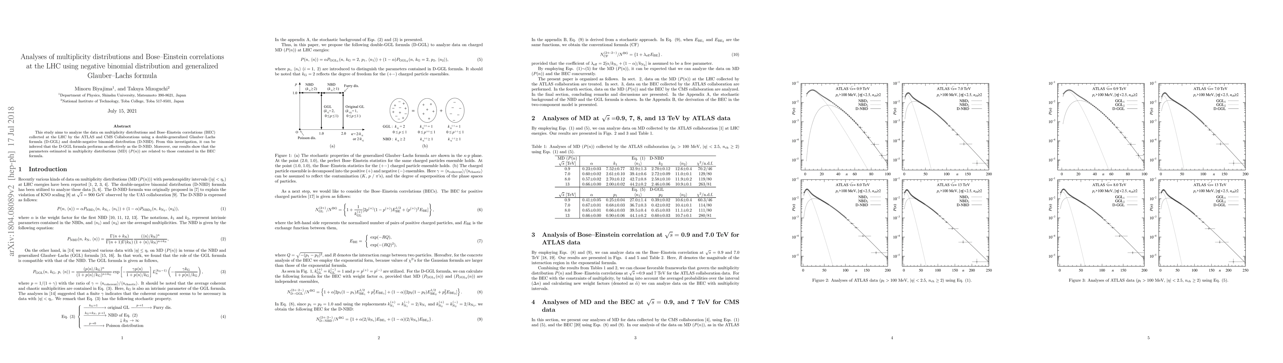This research analyzes LHC data on multiplicity distributions and Bose-Einstein correlations using the double-generalized Glauber-Lachs formula and double-negative binomial distribution, finding both methods equally effective. The study also reveals a relationship between parameters in multiplicity distributions and those in the Bose-Einstein correlation formula.